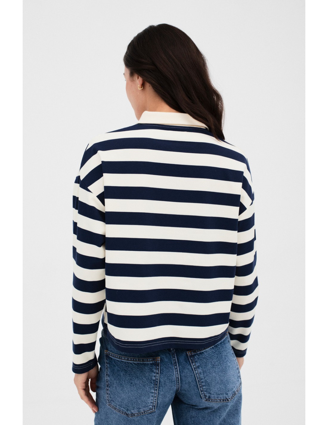 Pedralbes est un polo à larges rayures et manches longues. Il est doté d'un col et d'une patte de boutonnage en maille côtelée ton sur ton. Parfait pour un look décontracté.