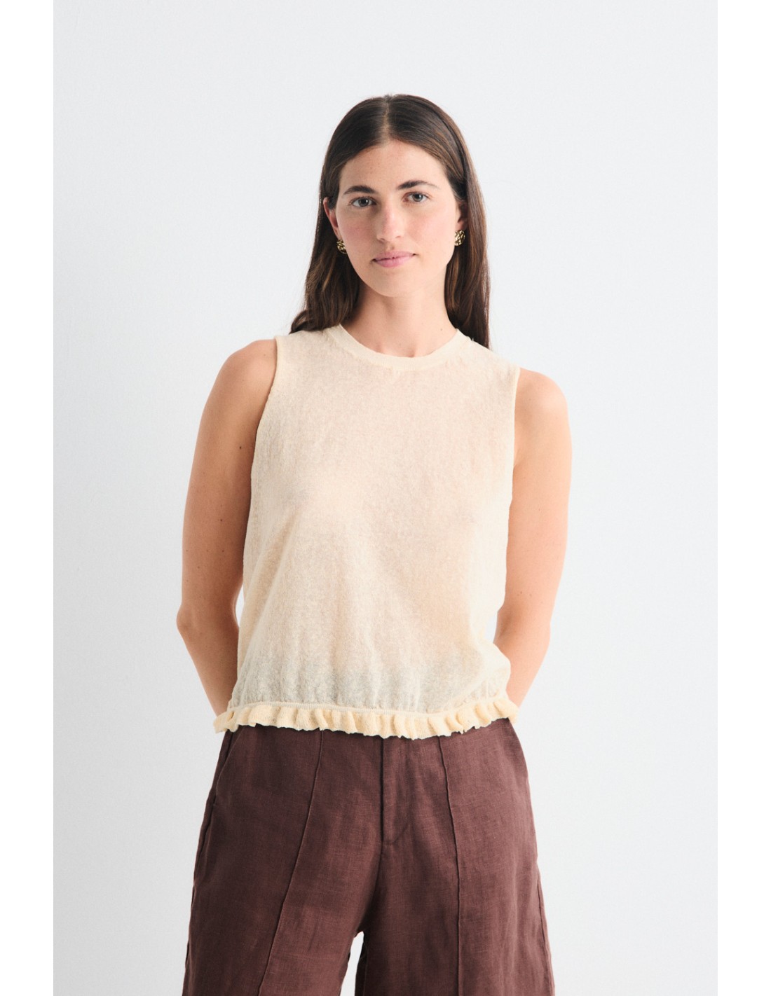 Top en tricot avec mini-volant à l'ourlet et col ras du cou côtelé. Associez-le au cardigan Mirri pour un total look moderne et romantique.