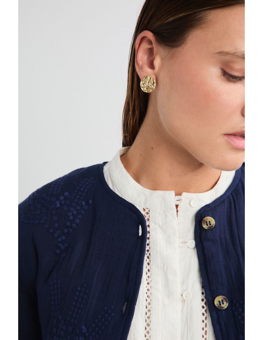 Veste matelassée avec broderie délicate, patte de boutonnage sur le devant, poches et manches longues. Un design romantique mais fonctionnel qui ajoute de la texture et de la chaleur. Fait partie de la famille des vestes et pantalons Altan.