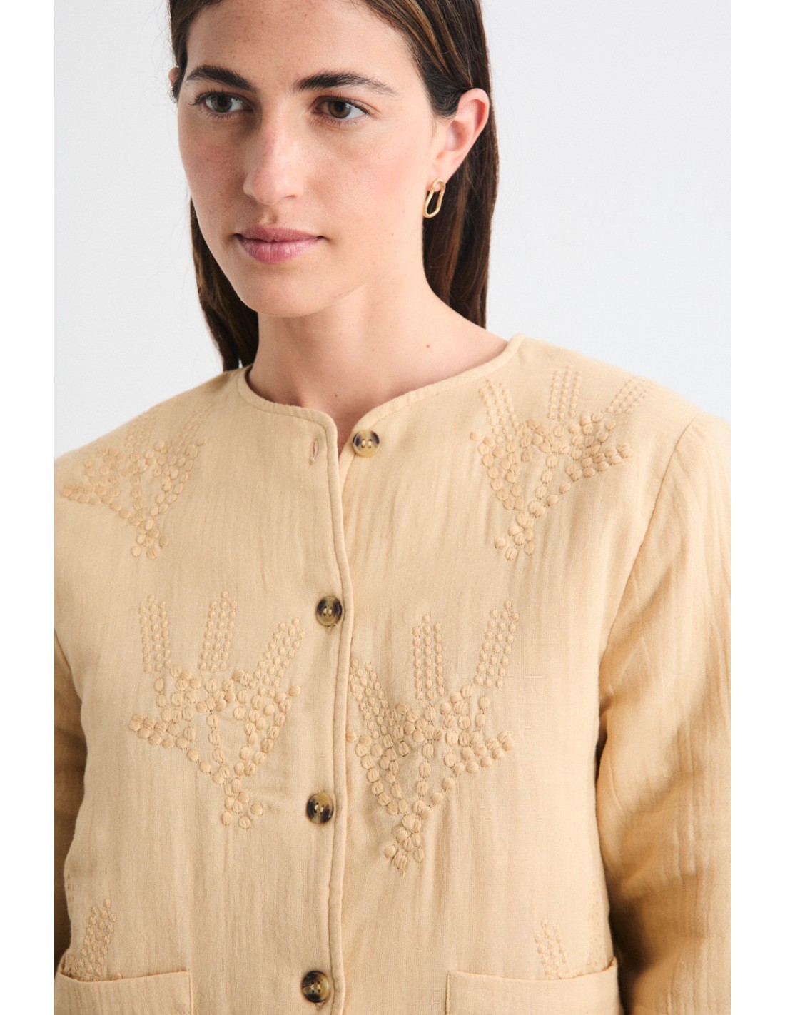 Veste matelassée avec broderie délicate, patte de boutonnage sur le devant, poches et manches longues. Un design romantique mais fonctionnel qui ajoute de la texture et de la chaleur. Fait partie de la famille des vestes et pantalons Altan.