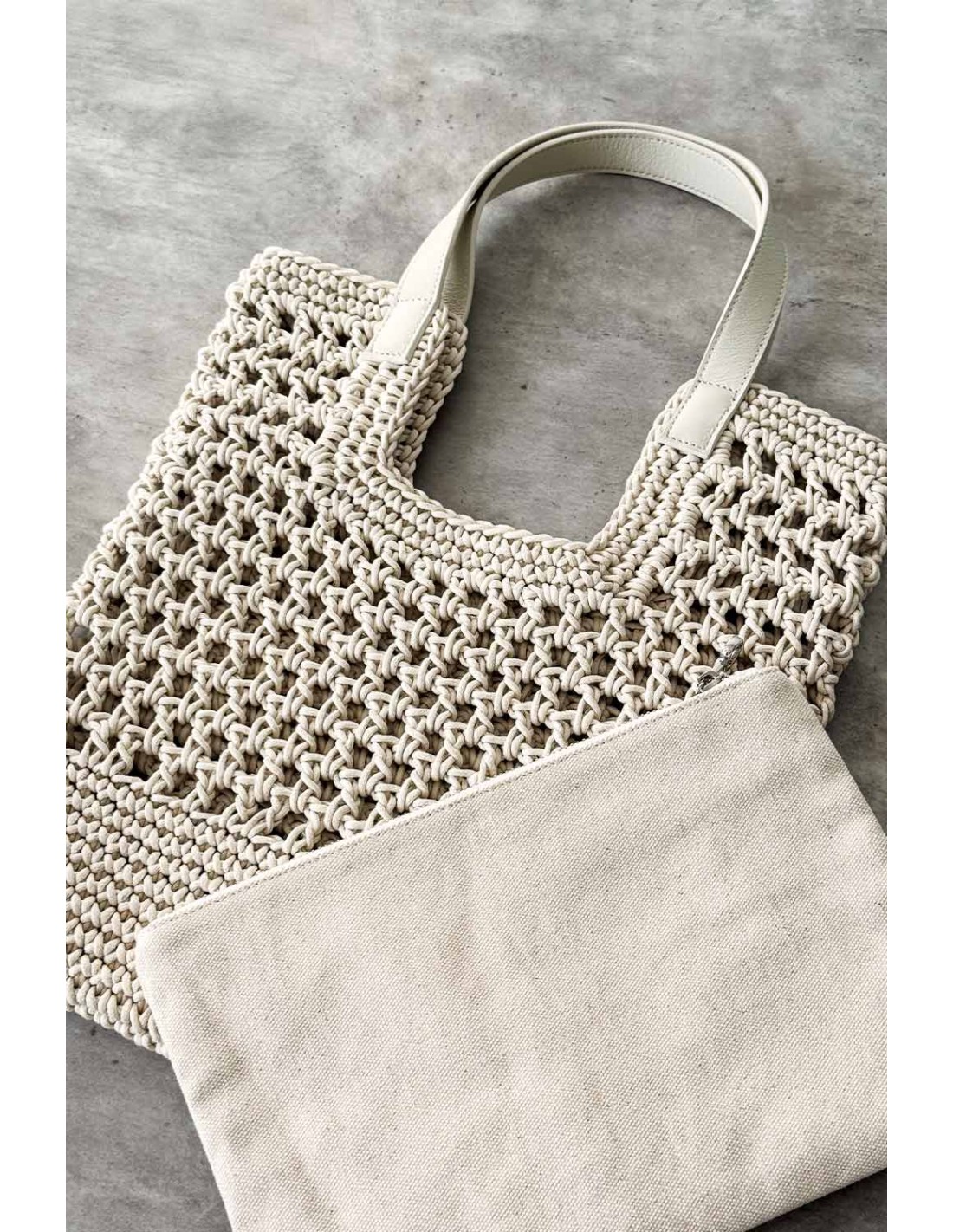 Crochet tote bag with leather handles and inner toiletry bag with metal zip.