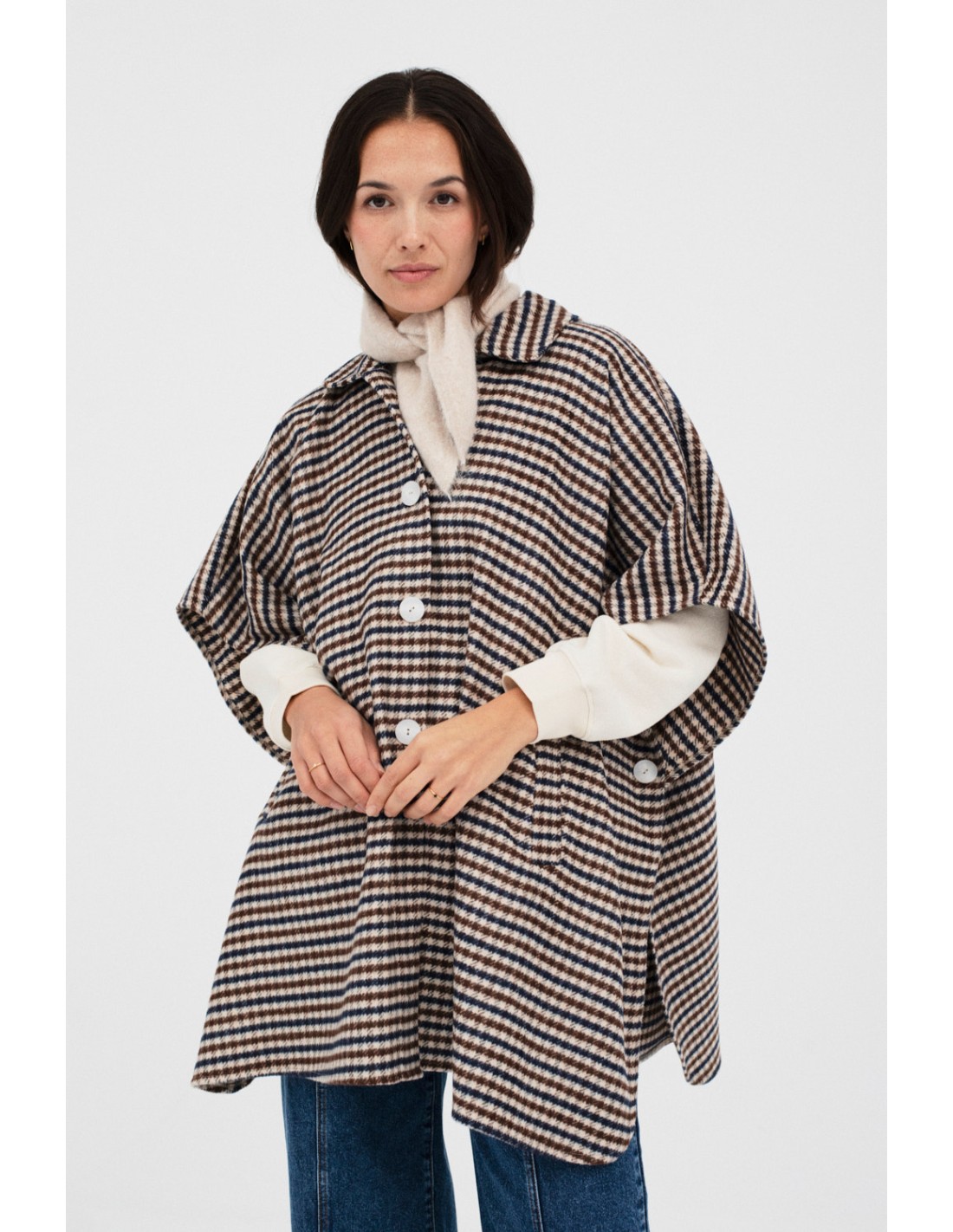 A cape-style coat with an elegant and functional design. It features rounded sides and button fastening, as well as a front button fastening and practical pockets.