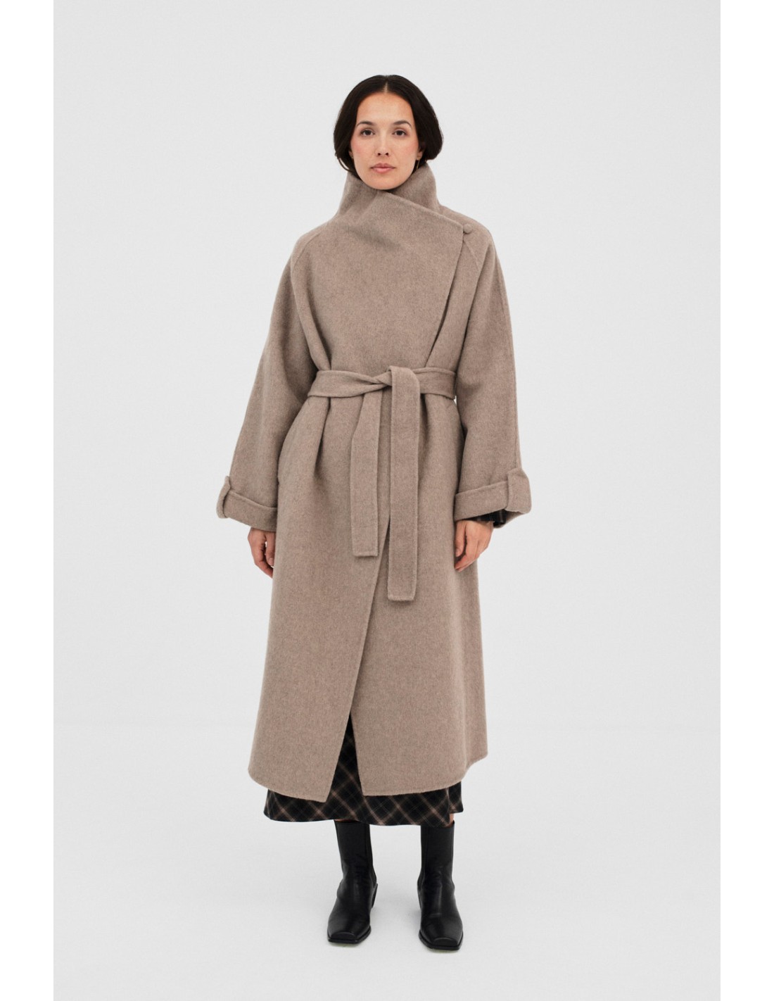 Elysses is a long wrap coat, with a button fastening, with a button fastening at the shoulder and a belt. It has two pockets. Ideal for an elegant and comfortable look.