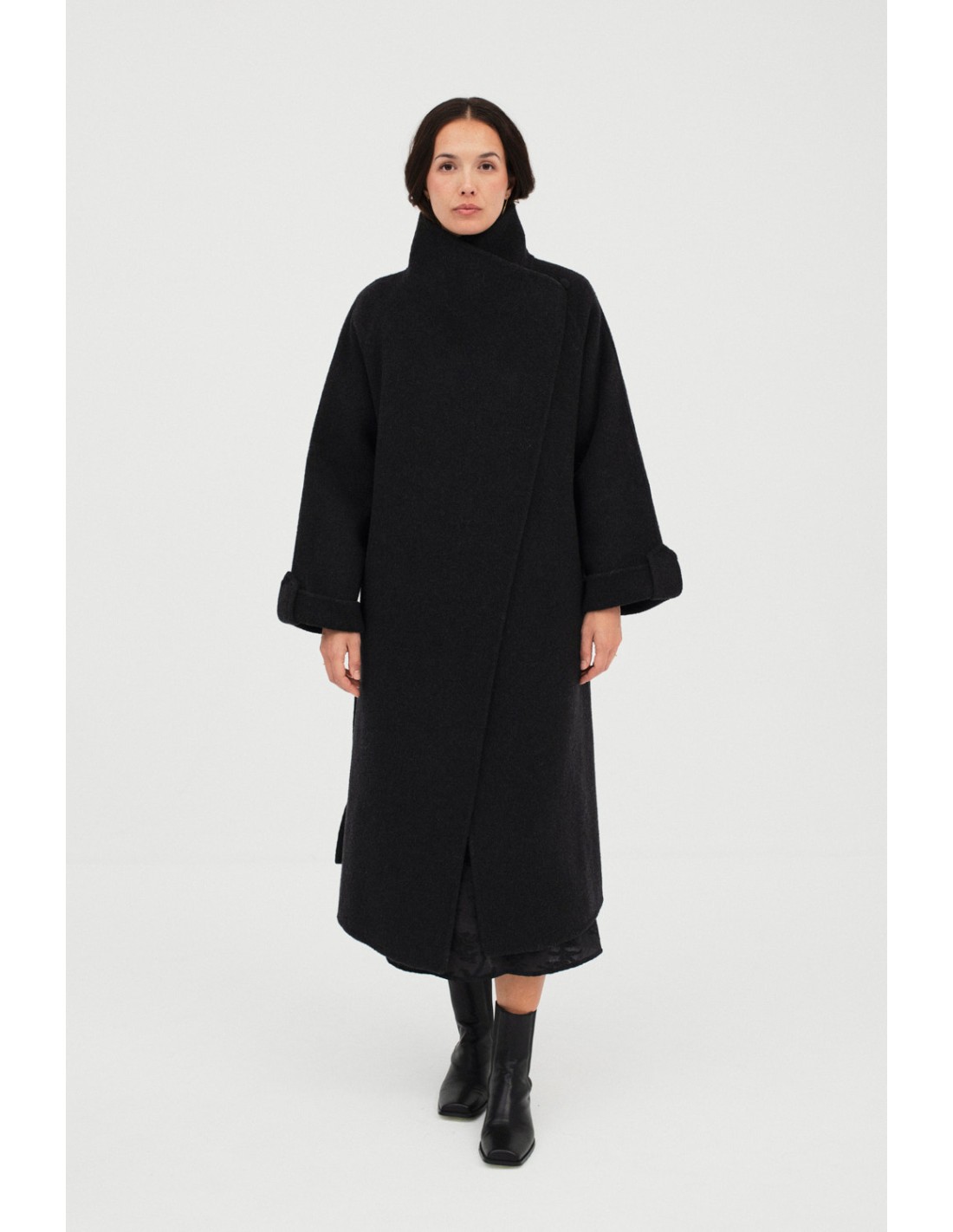 Elysses is a long wrap coat, with a button fastening, with a button fastening at the shoulder and a belt. It has two pockets. Ideal for an elegant and comfortable look.