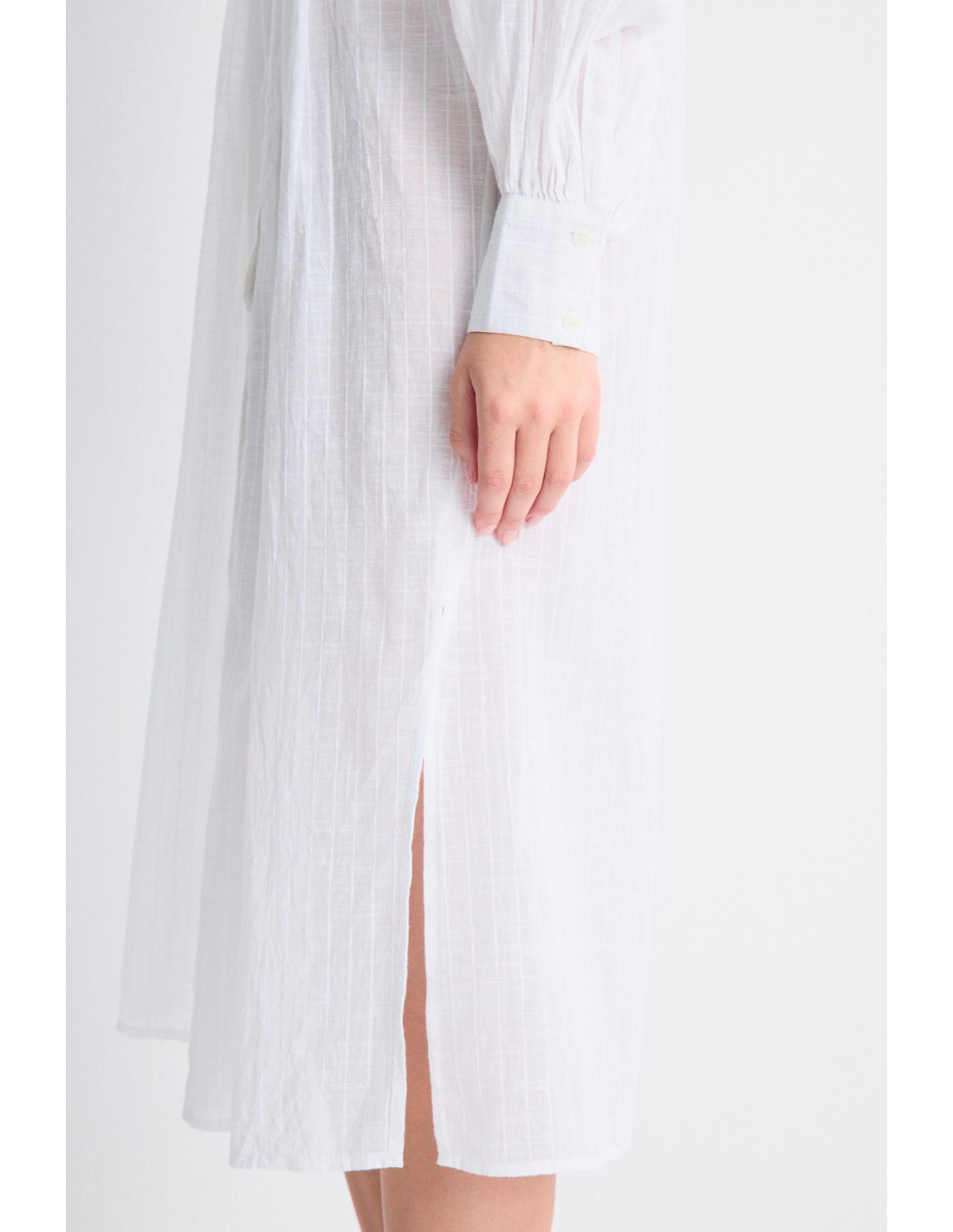 Wide shirt dress with mao neckline and front pleats. Central button fastening and long sleeves. Ideal for a relaxed look with a sophisticated touch. Discover also the Sare shirt from the same family.