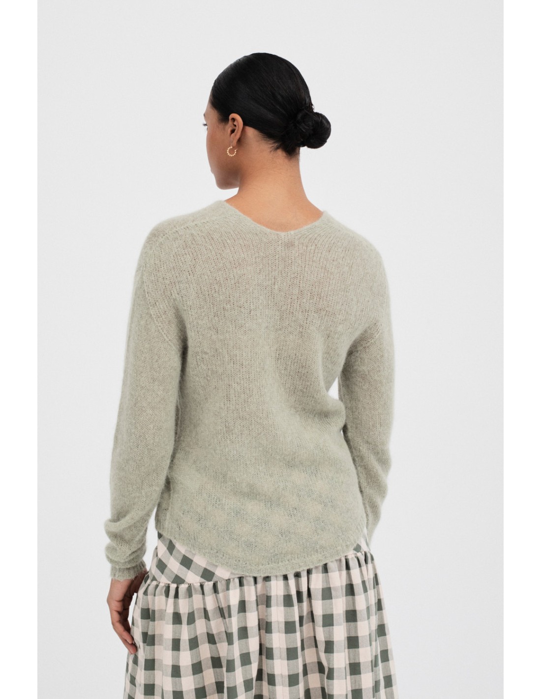 Trevi is a plain knitted jumper with a V-neck, long sleeves and rounded hem. It is completely made of tricot and perfect for a comfortable and modern look.