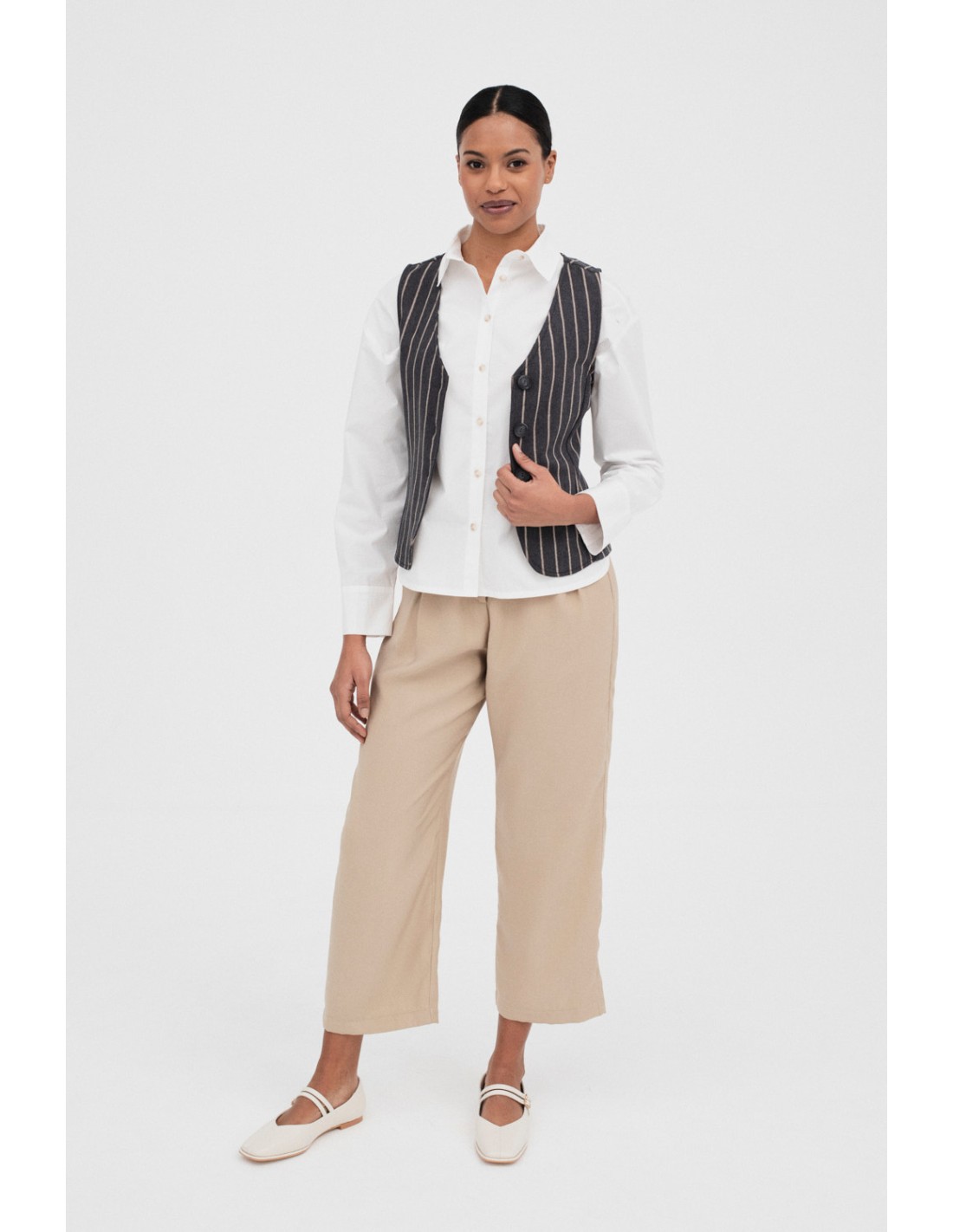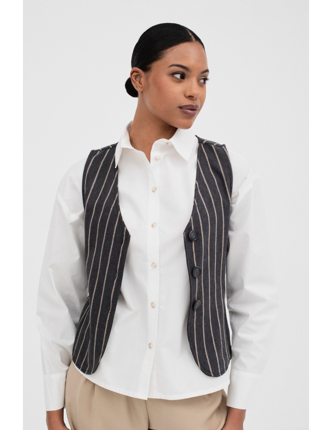Pinstriped waistcoat with front button fastening and rounded hems. It stands out for the detail of the lacing at the back, fully adjustable to your liking. Combine with Vorota trousers for a total look.