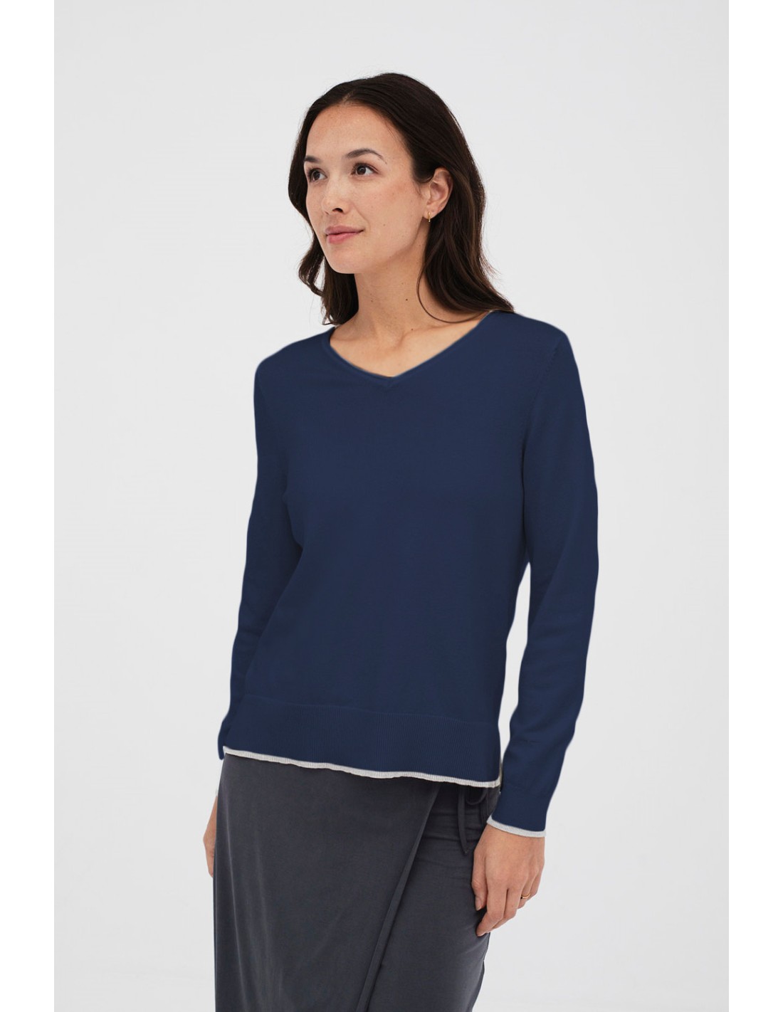 Basic knitted jumper with long sleeves and a V-neck. The cuffs and hem are trimmed with an elegant contrasting colour, giving it a modern and sophisticated style. Coordinates perfectly with the Naka trousers.