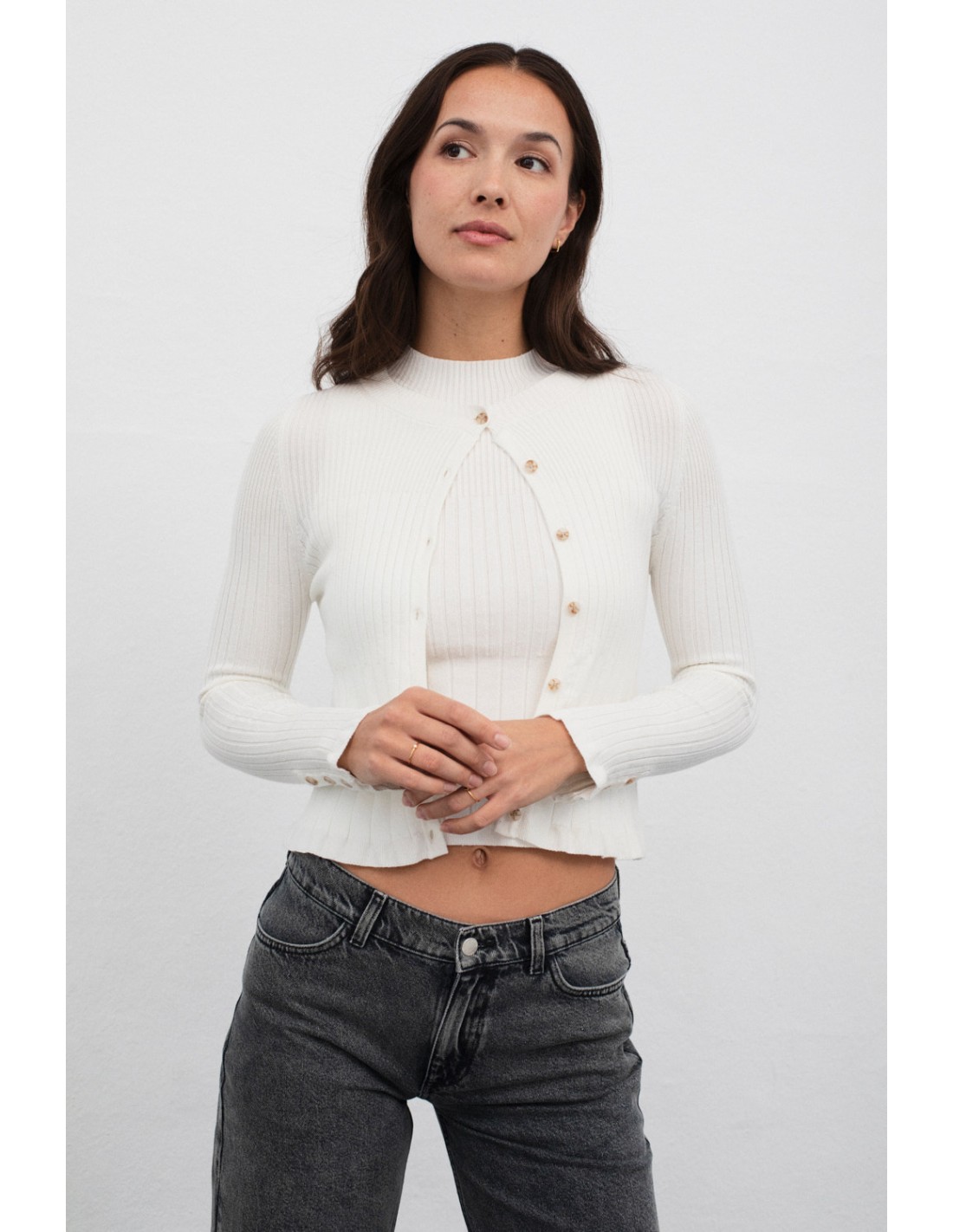 Long-sleeved, straight-cut cardigan with an unique design combining three different types of ribbing on the body and two on the sleeves. It has a round neck and a front button placket. The cuffs feature a three-button detail. It pairs perfectly with the Seef top for a two-piece design.