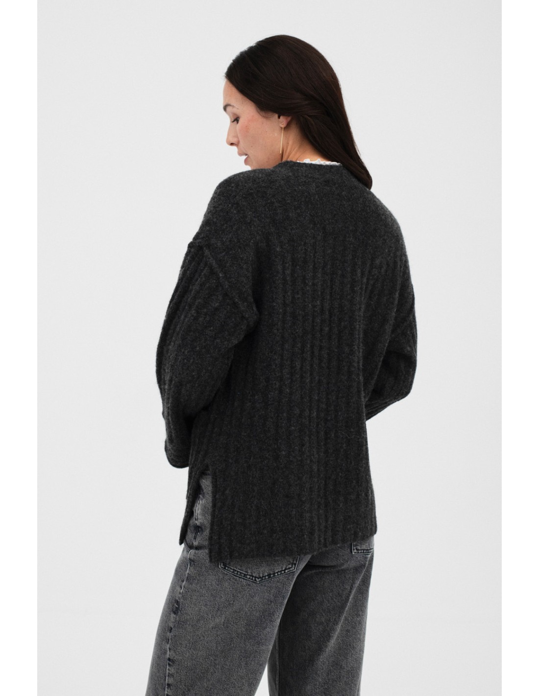 Ribbed, knitted cardigan detailed with horizontal ribbed cuffs folded to the outside. Button front opening and side slits. It features two front pockets. Wear it with Bukon and Busan accessories.