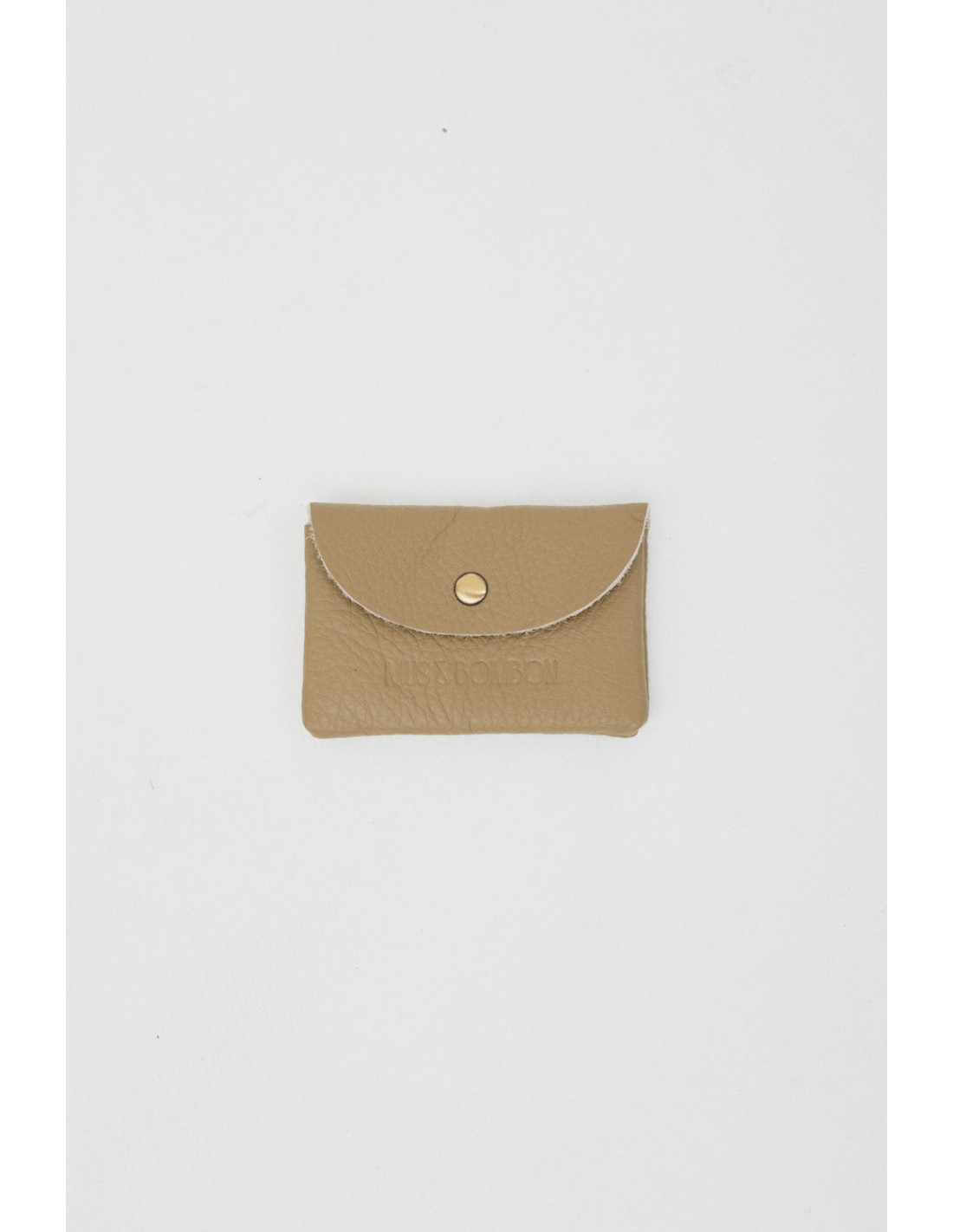 Small leather purse with a snap button closure in the centre. It has the Mus&Bombon logo engraved on the outside.