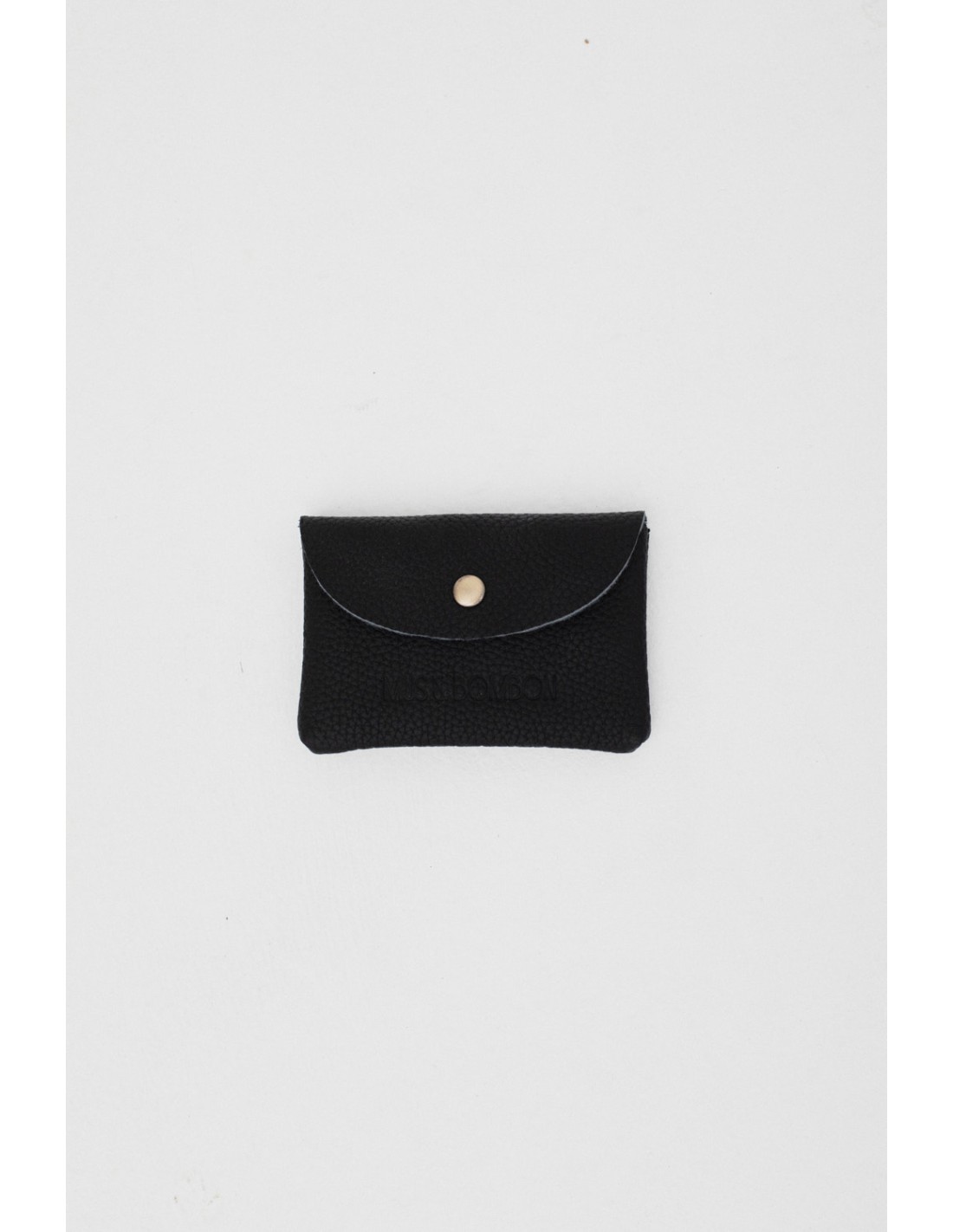 Small leather purse with a snap button closure in the centre. It has the Mus&Bombon logo engraved on the outside.