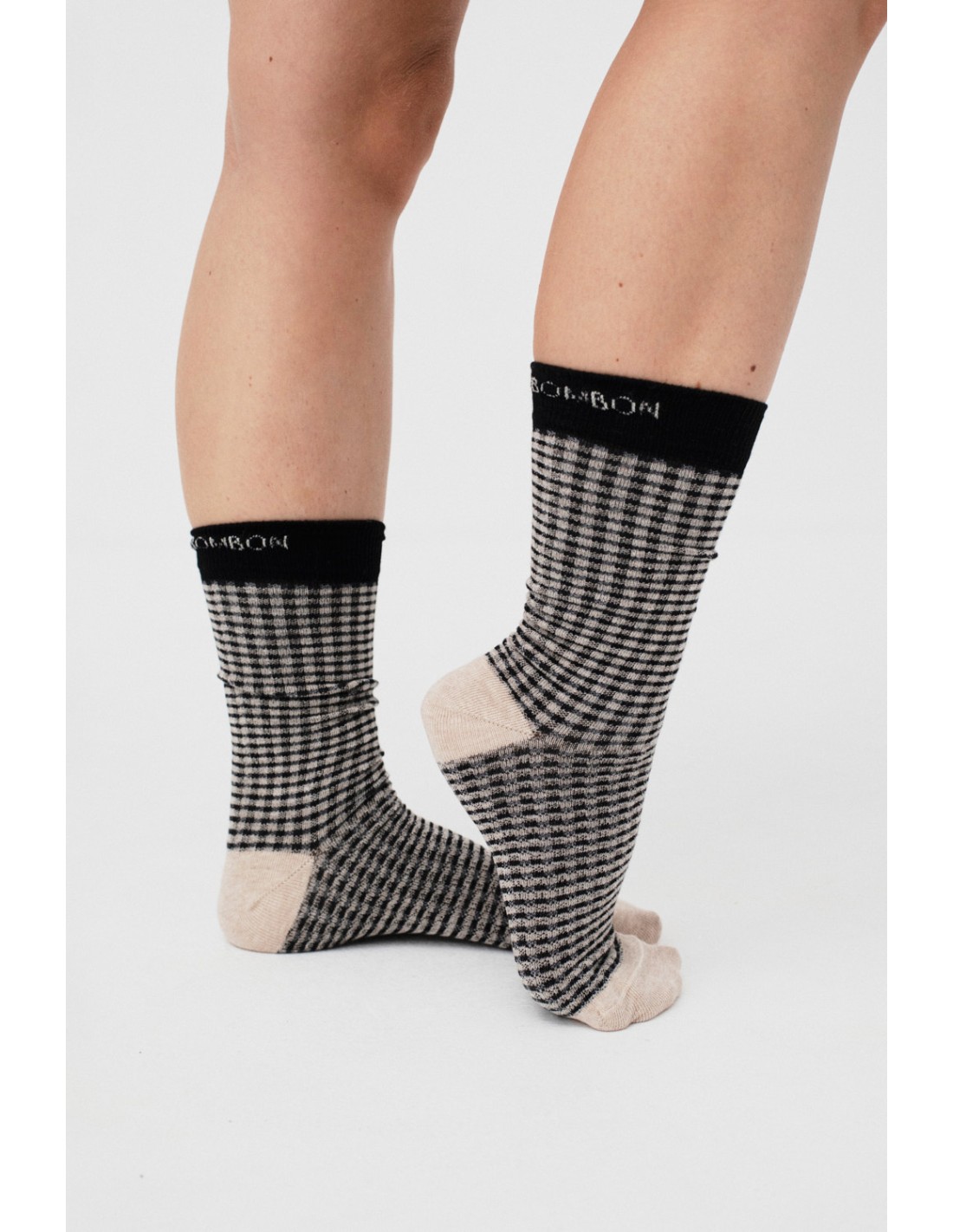 Mid-calf socks with a ribbed detail on top. Matching sole, heel and elastic, with the Mus&Bombon logo at base. Designed with prints from the collection.