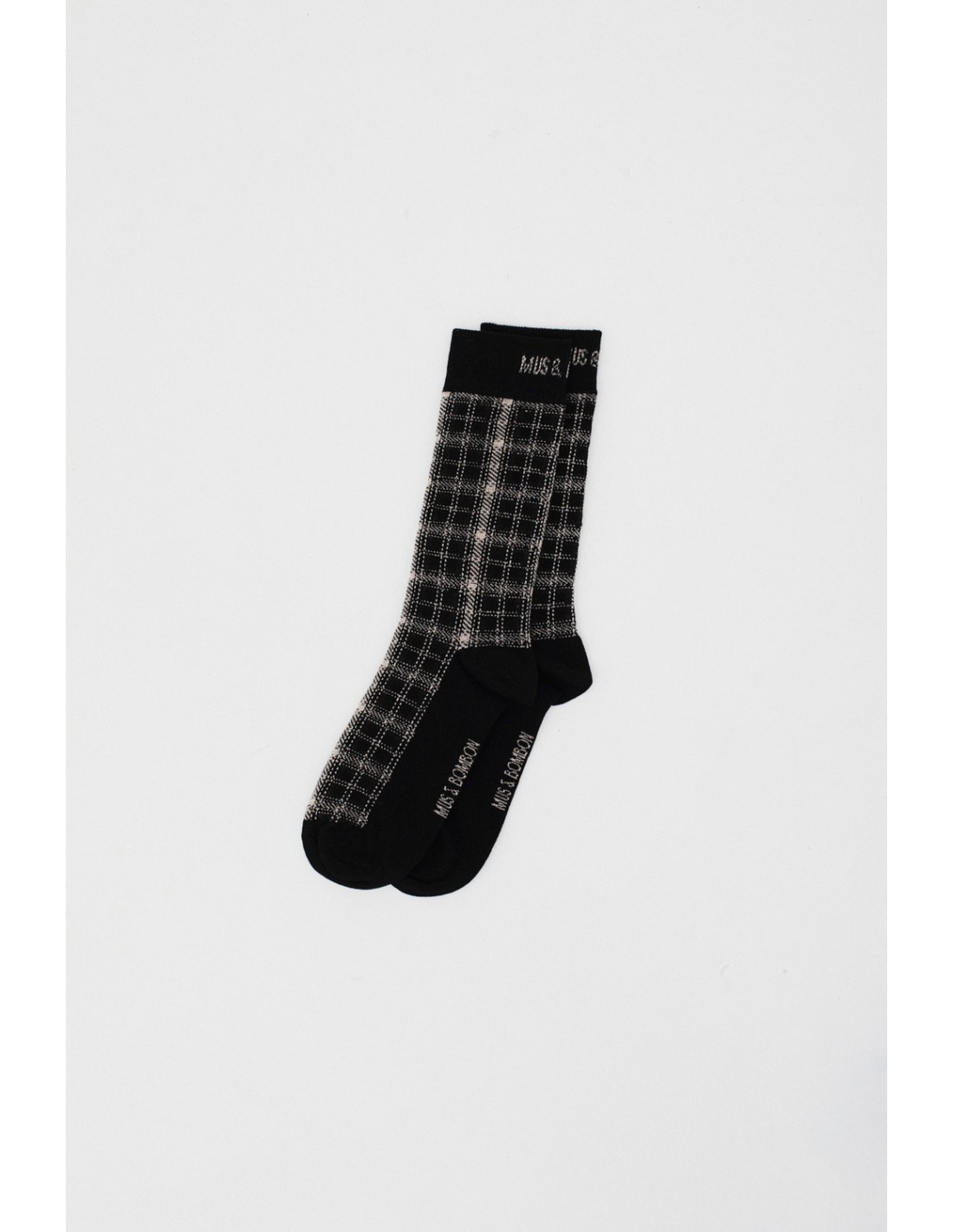 Mid-calf socks with a ribbed detail on top. Toe, sole, heel and elastic to match the bottom. With Mus&Bombon logo on the bottom. Designed with prints from the collection.