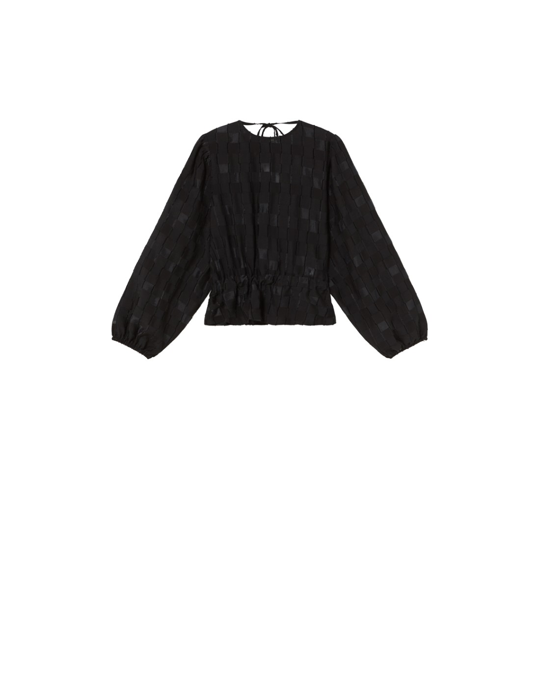 Blouse in special fabric with gathering at the waist, mini ruffle at the hem and puffed cuffs. V-neckline at the back, with lacing at the nape of the neck. Combines with Queens trousers.