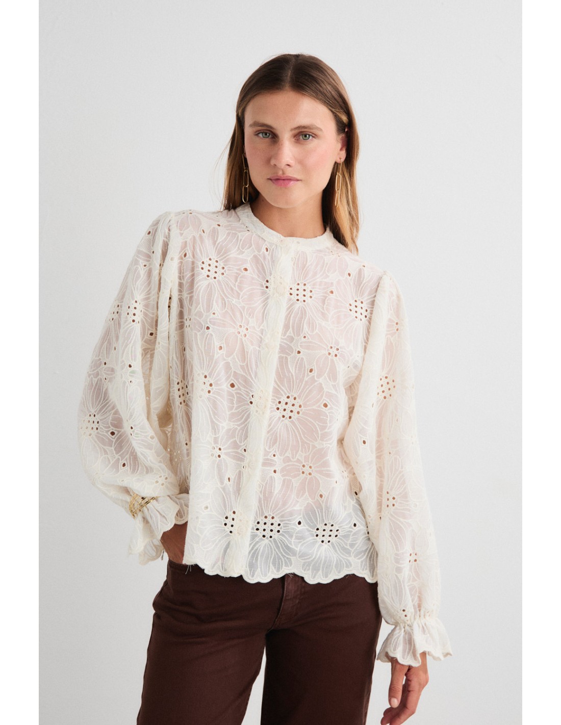 Jacquard blouse with mao neckline, wide puffed sleeves and hem with waves that follow the pattern of the fabric, giving it the romantic touch you are looking for. It is part of the Evelia family along with the waistcoat in the same fabric.