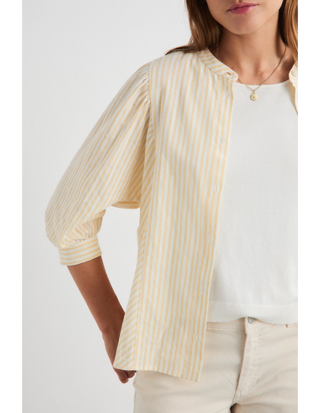 A striped shirt with a mao collar, three-quarter-length puffed sleeves and front button fastening. A romantic garment with a contemporary feel that adapts naturally to any occasion.