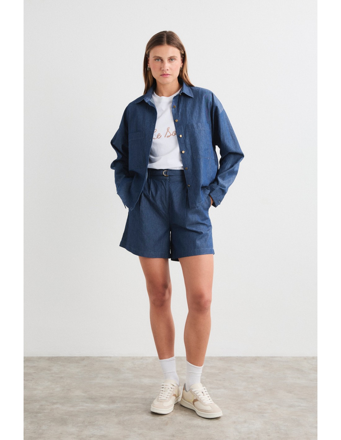 Shirt with lapel collar and front button fastening, long sleeves with open cuffs and button at the back. It features two front pockets and a back yoke. Pair with the Banten trousers or shorts for a sophisticated total look, ideal for city days.