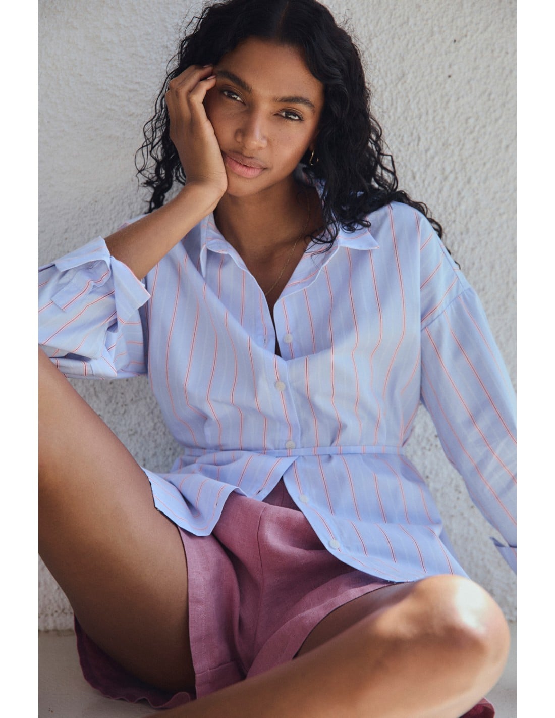 Oversize striped shirt with rounded hems, long sleeves and back strap detail with belt loops, which allows you to adjust the waist or wear it as a belt. Wear it with the Icaro shorts for a total look with a modern twist.