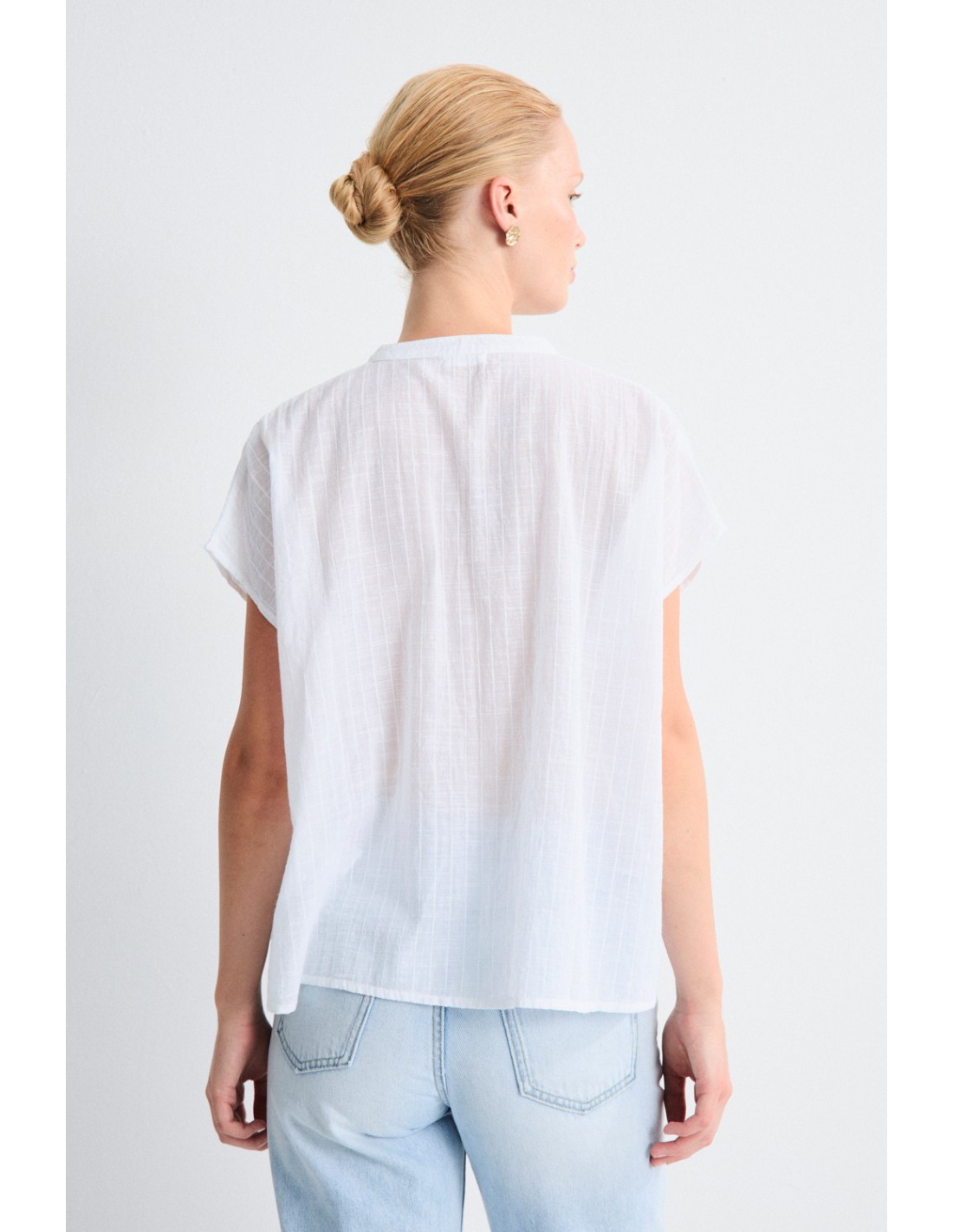 A blouse with a mao neck, wide cut and V-neckline, with central button placket and side slits for fluid movement. It is part of the same family as the Sare dress.