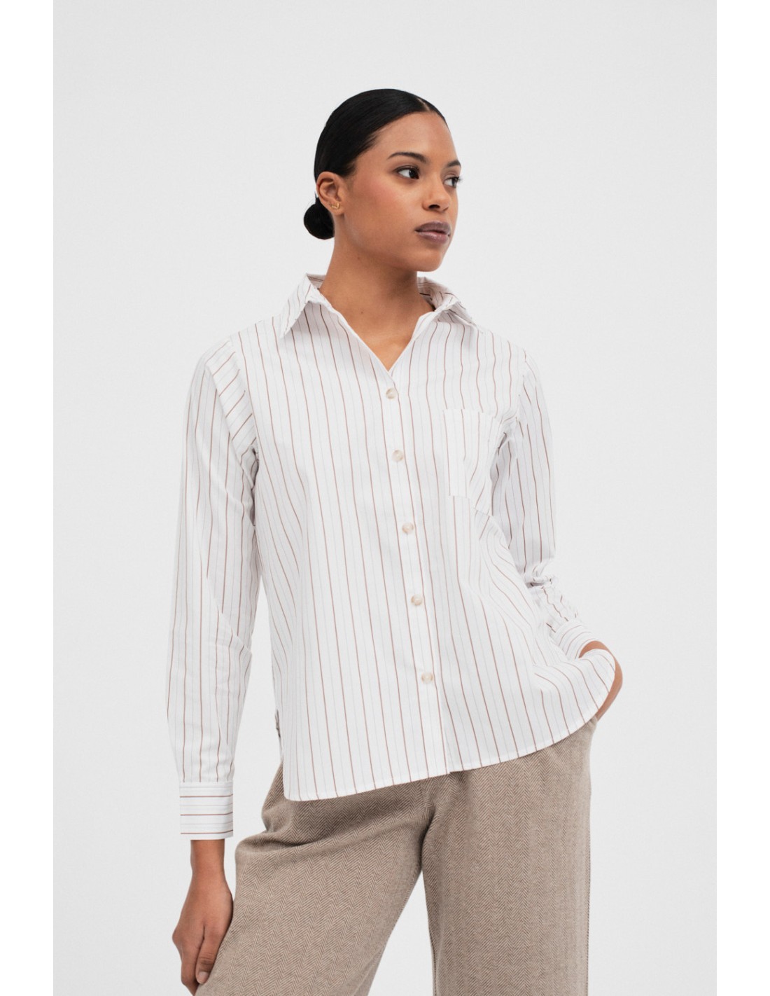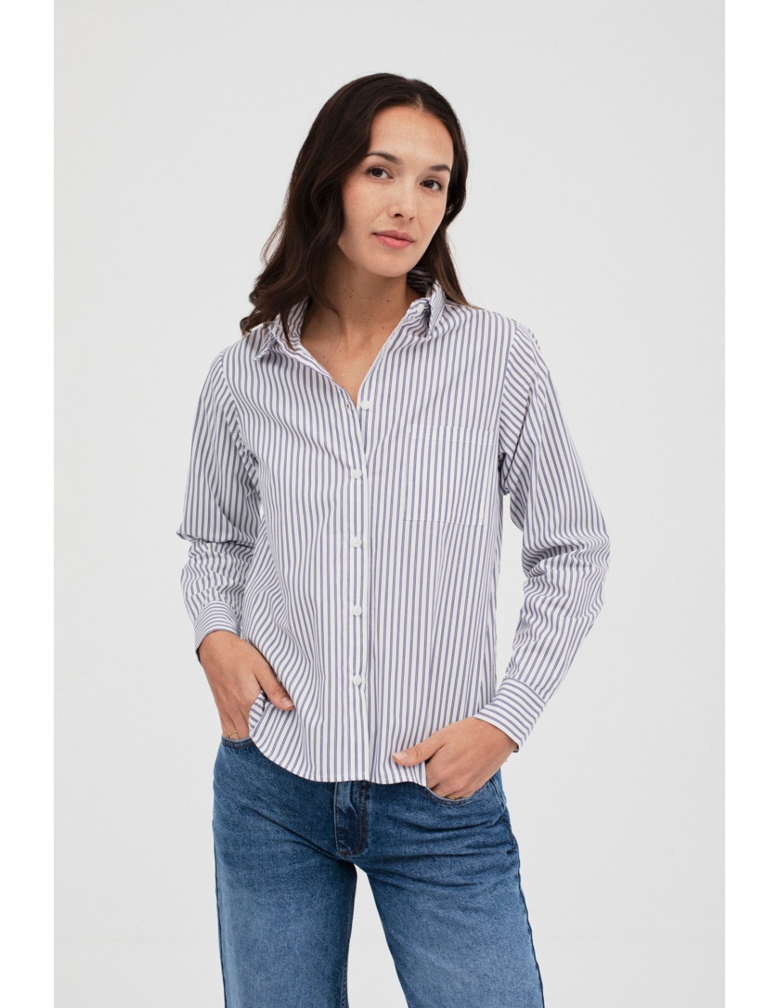 A striped cotton shirt with a shirt collar, yoke and chest pocket. It has side slits and double button cuffs. Perfect for the office.