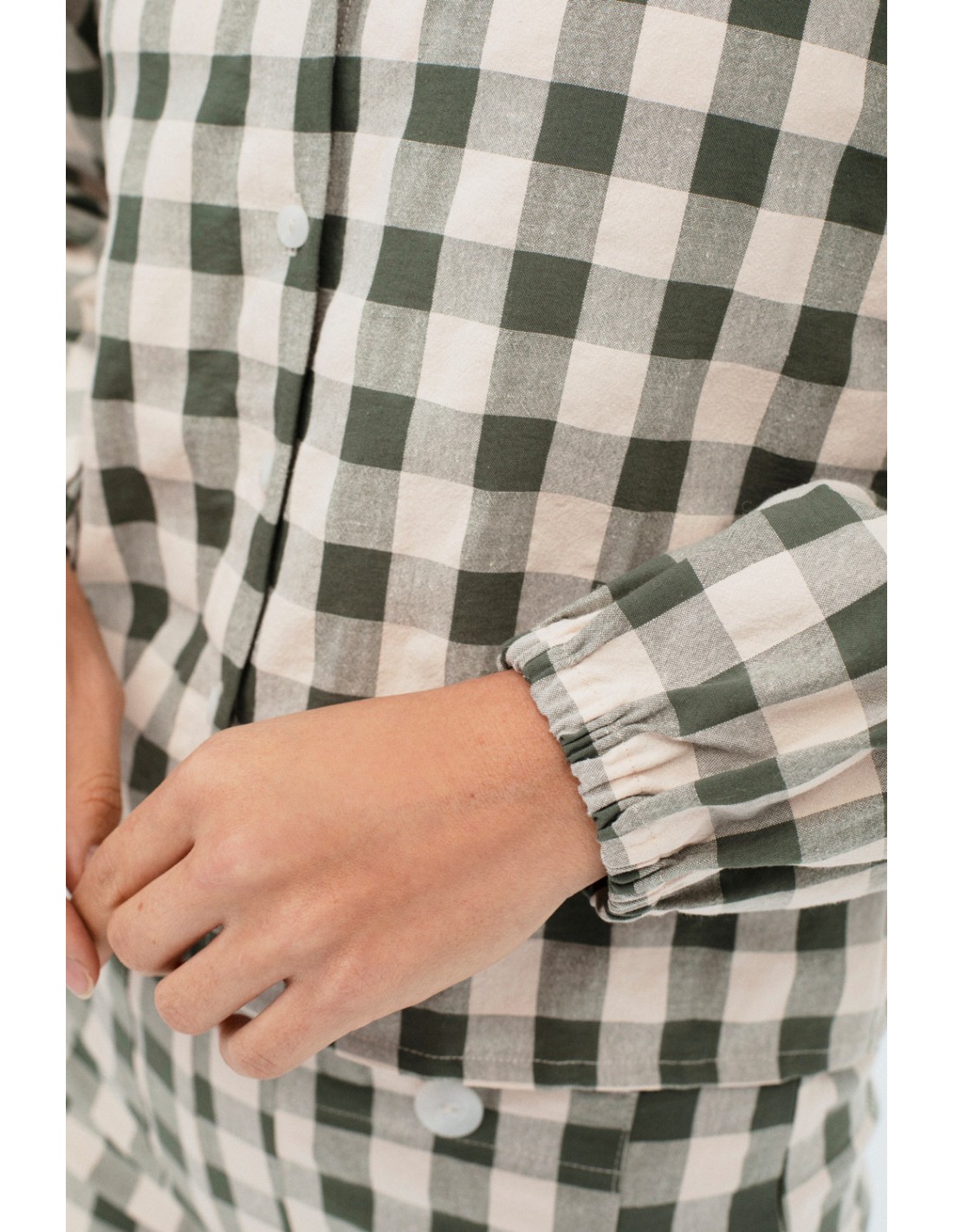 Vichy blouse with shirt collar, buttons on the front and puffed sleeves with elastic cuffs. Combine it with the Marylebone skirt or the Malasaña trousers for a complete look.