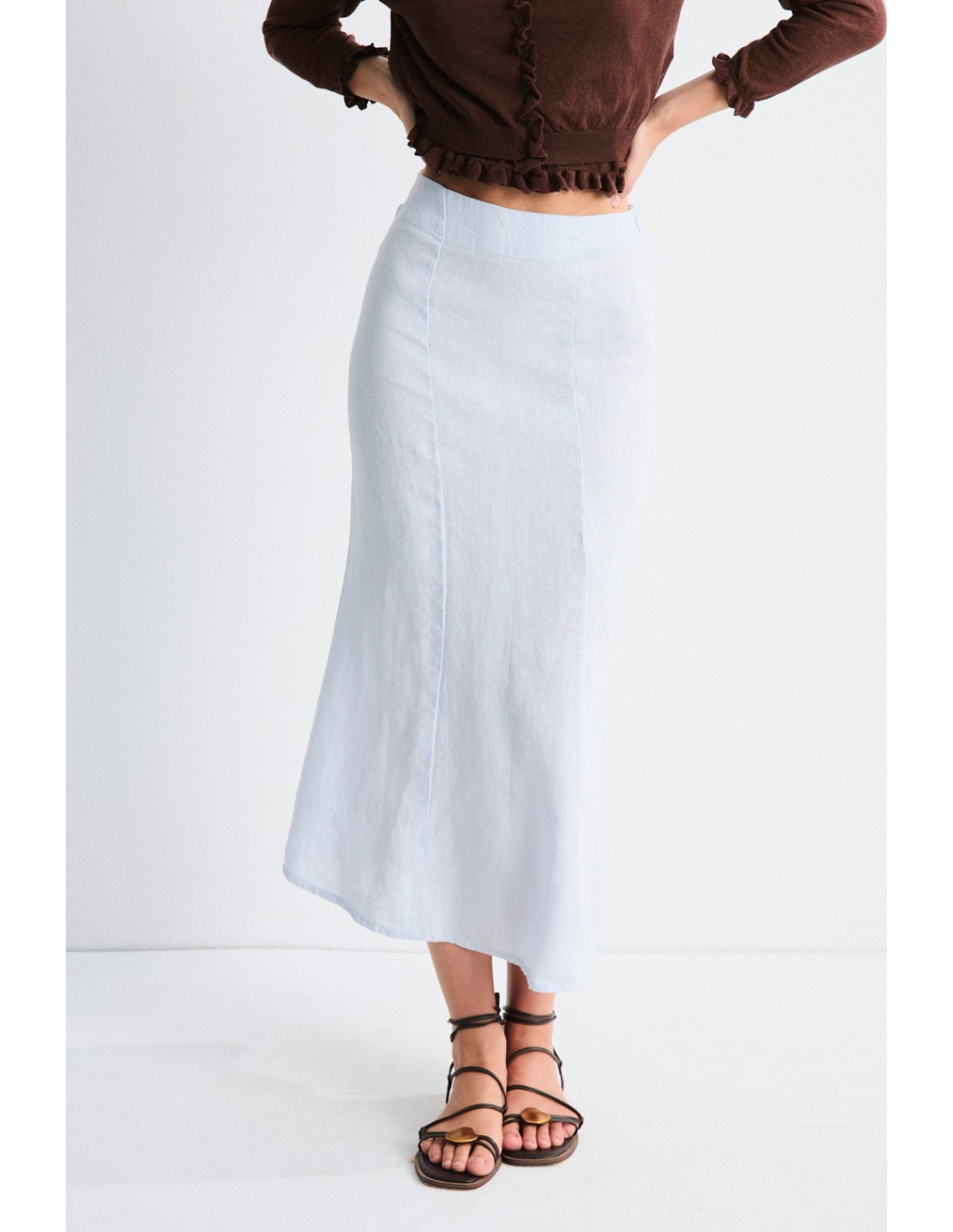 Leather sandal with thin leather straps and golden metallic detail in the finger part. Mus&Bombon logo engraved on the insole.