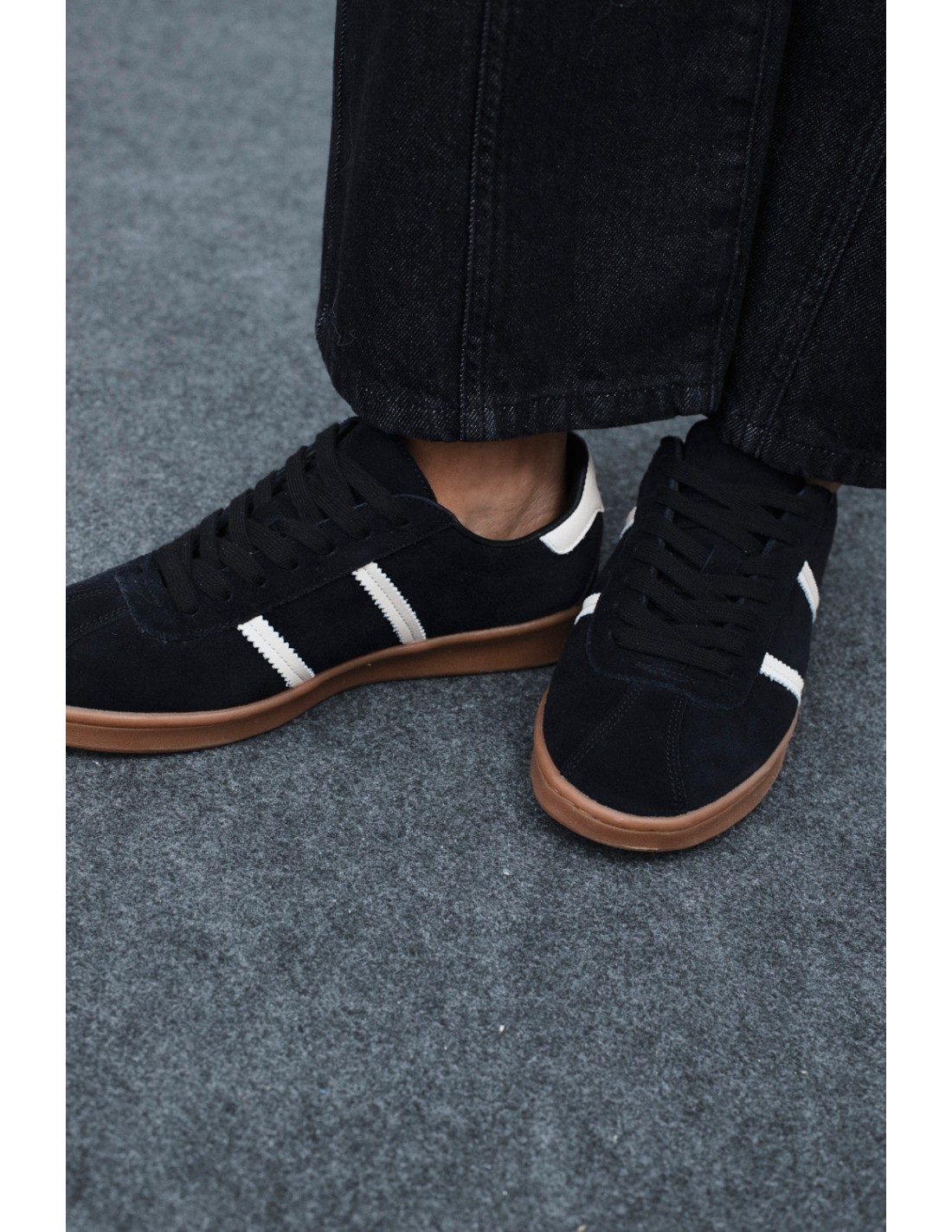Split leather sneakers with two side stripes in contrasting colour. Rubber sole and tone-on-tone flat laces. It also features the Mus&Bombon logo on the heel and insole.