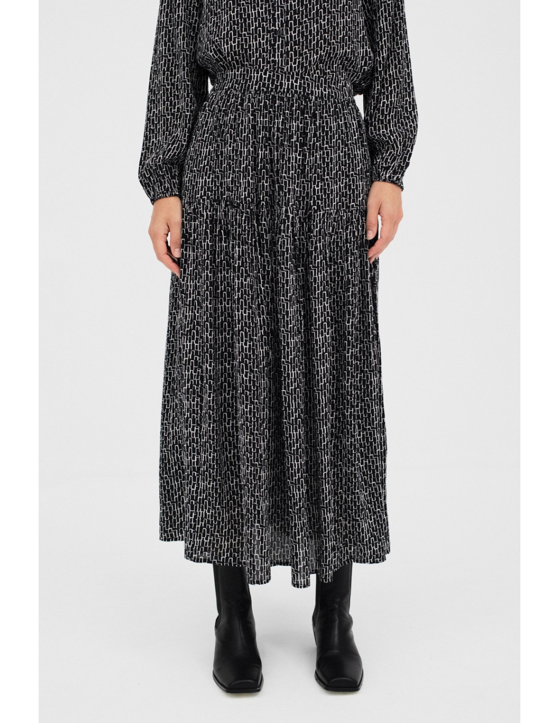 Arrayan is a printed, double-layered, floaty skirt with practical side pockets. Combine it with the Annex blouse for a unique total look.