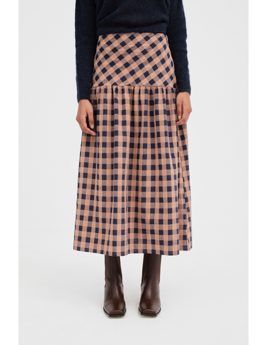 Vichy long skirt with a fitted yoke and a hip-length flounce, invisible zip fastening at the side and flat elastic at the back. Combine it with the Marlene blouse and the Whitehall bag.