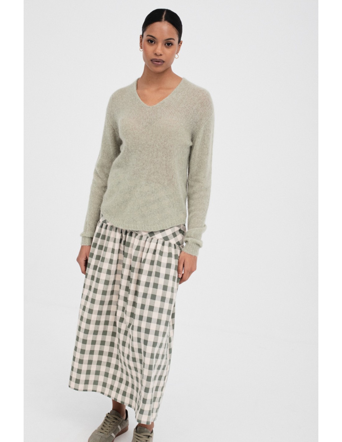 Vichy long skirt with a fitted yoke and a hip-length flounce, invisible zip fastening at the side and flat elastic at the back. Combine it with the Marlene blouse and the Whitehall bag.