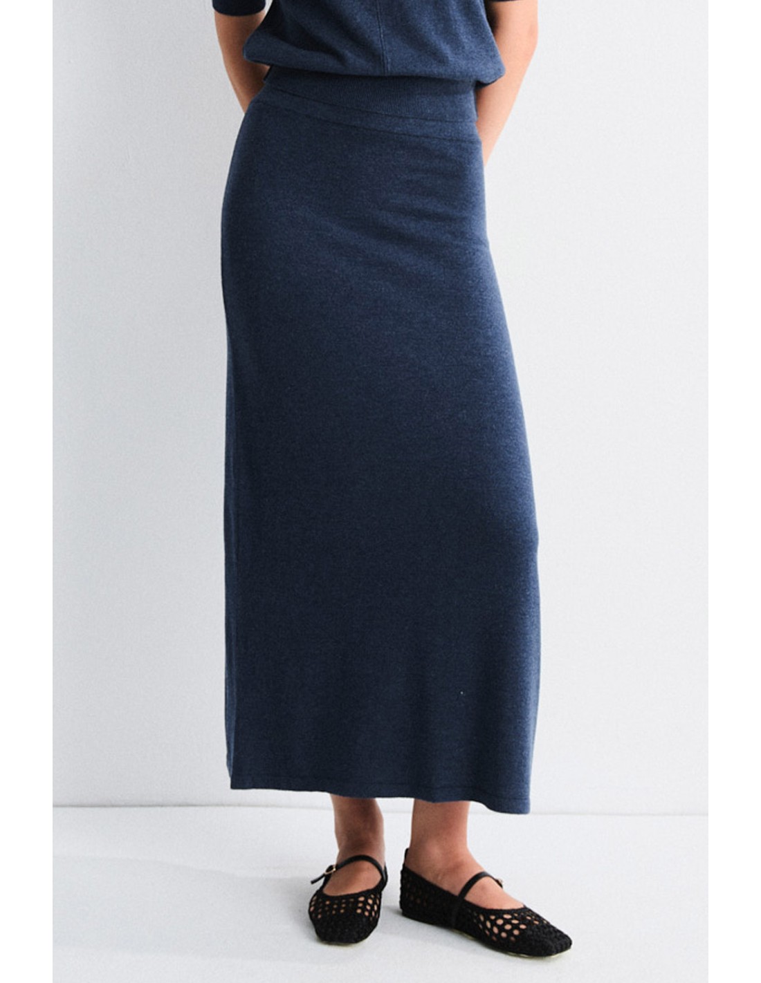 Long, fine knit skirt with elasticated waist and straight cut. Its soft fabric and fluid drape make it a comfortable and elegant garment. Ideal for wearing with the matching Celeno jumper.