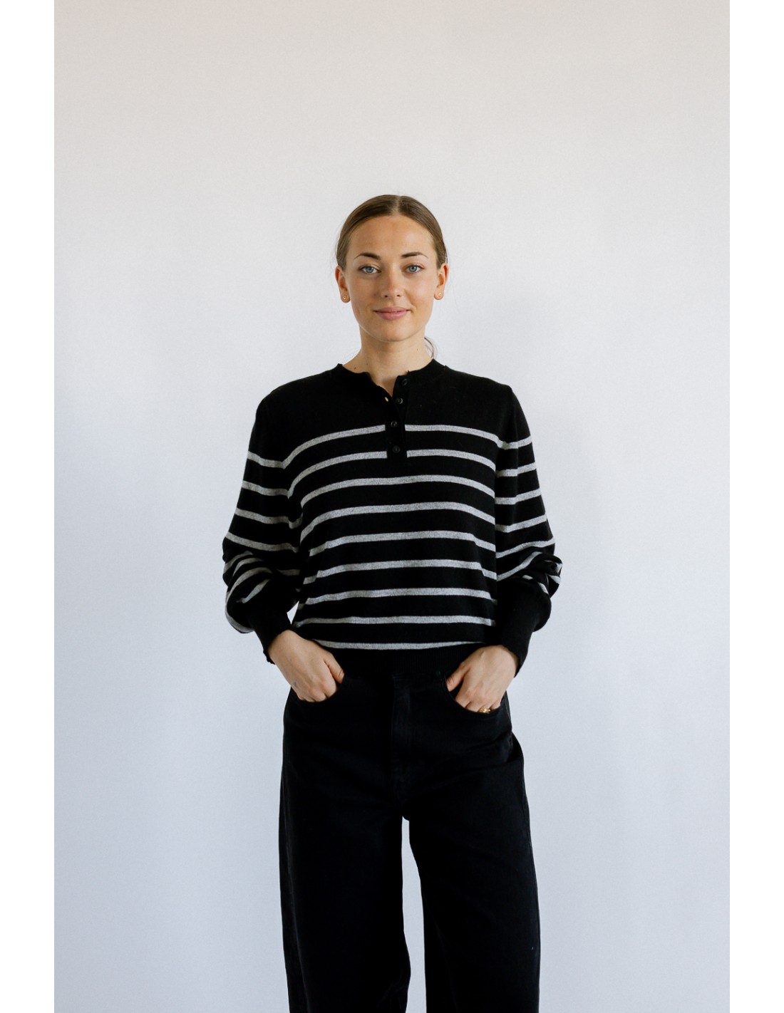 Long sleeve jumper with round neck and ribbed placket with buttons; 2x1 ribbed cuffs and hem. Single jersey body with contrasting stripes; set-in sleeves.