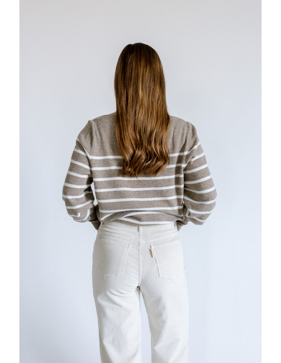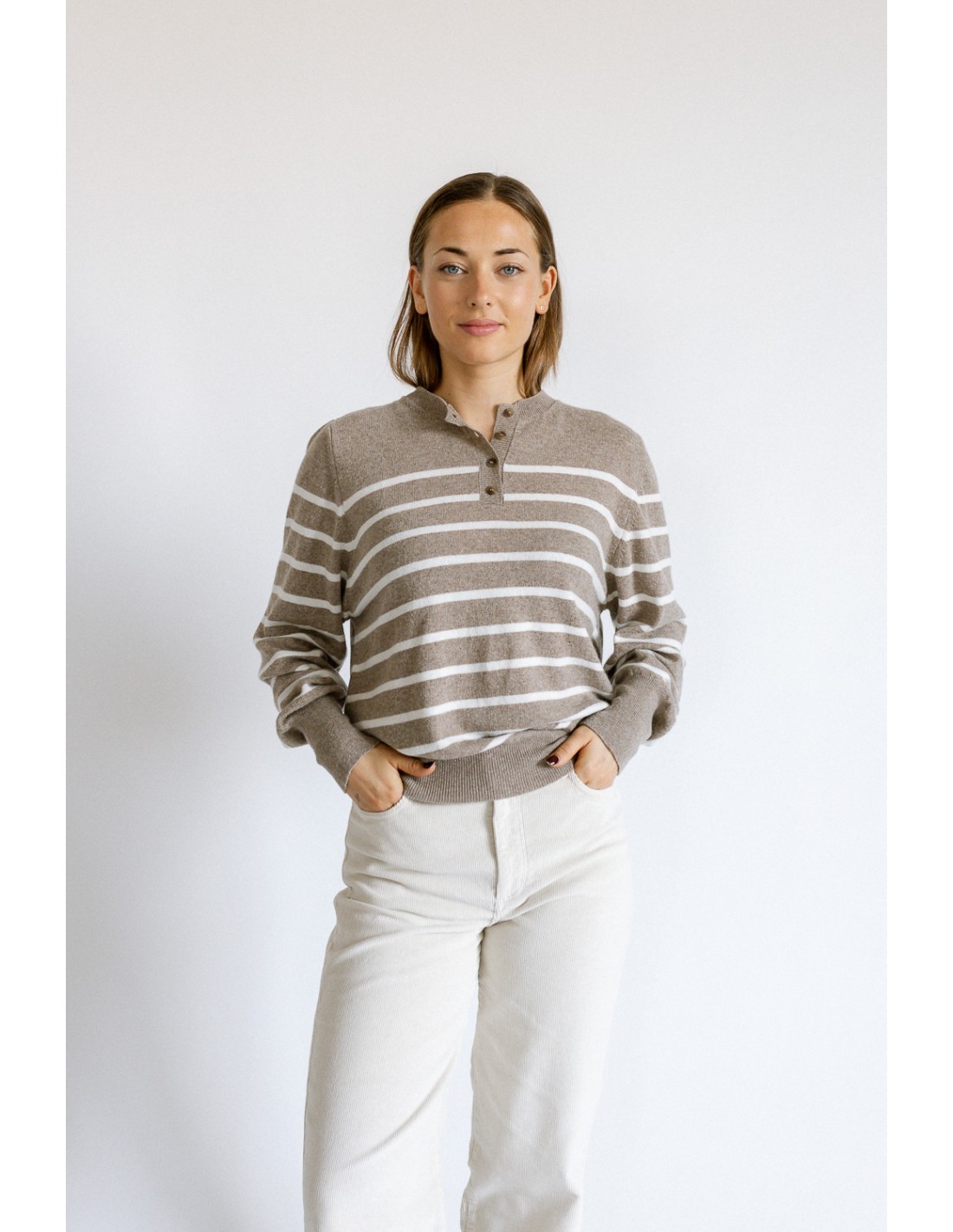 Long sleeve jumper with round neck and ribbed placket with buttons; 2x1 ribbed cuffs and hem. Single jersey body with contrasting stripes; set-in sleeves.