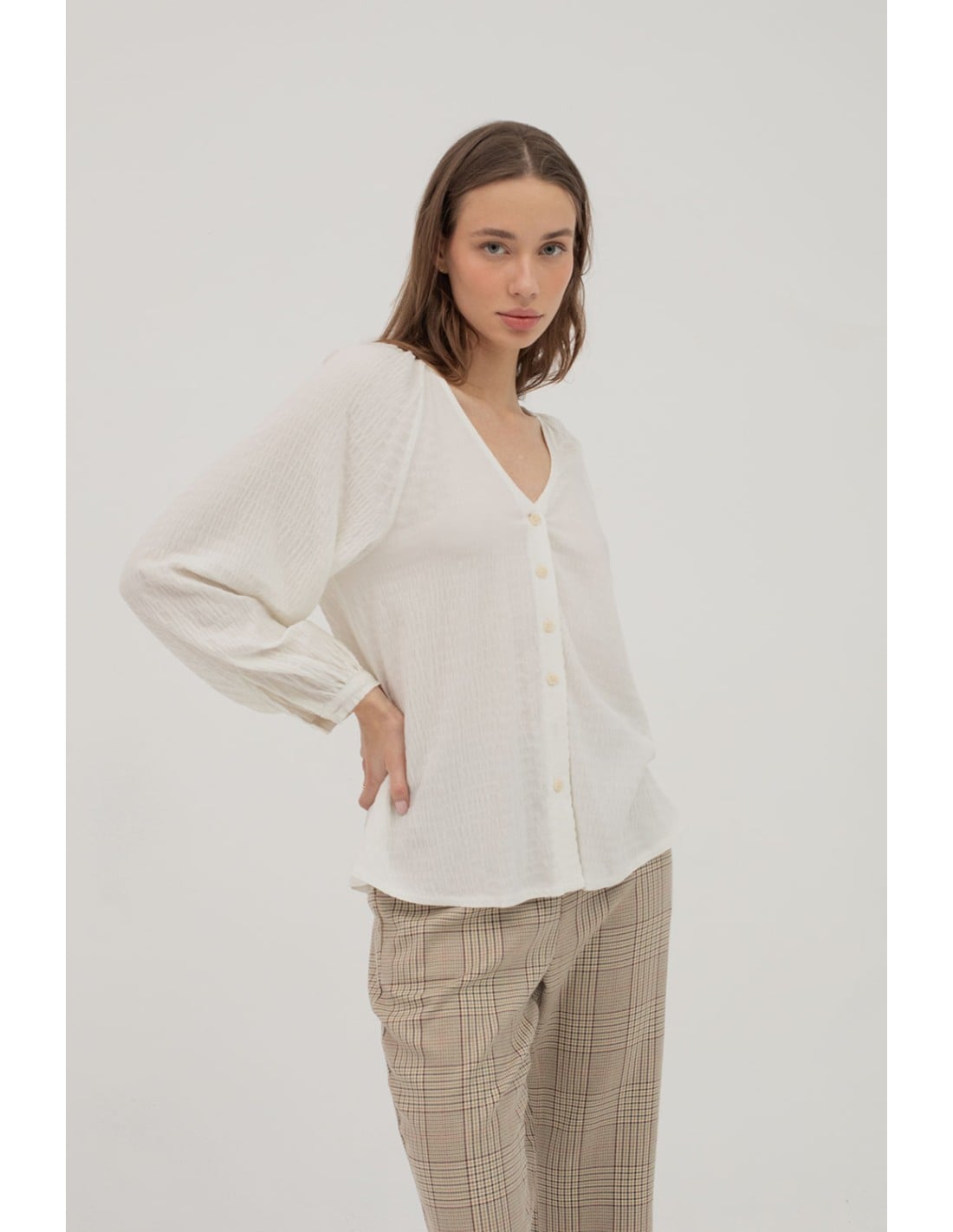 The Isna blouse, with its flowing design and ruffle details on the cuffs and neckline, will win you over with its embossed fabric and special feel. If you like this blouse, don''t miss the Insua dress.