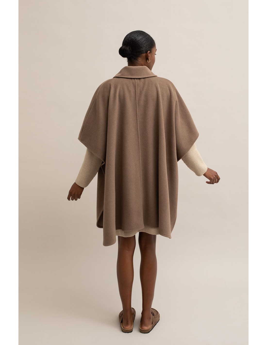 This cape-style coat features rounded sides, is kept semi-open by buttons on the sides, has a front button fastening and has pockets on the front, offering a stylish and functional design.