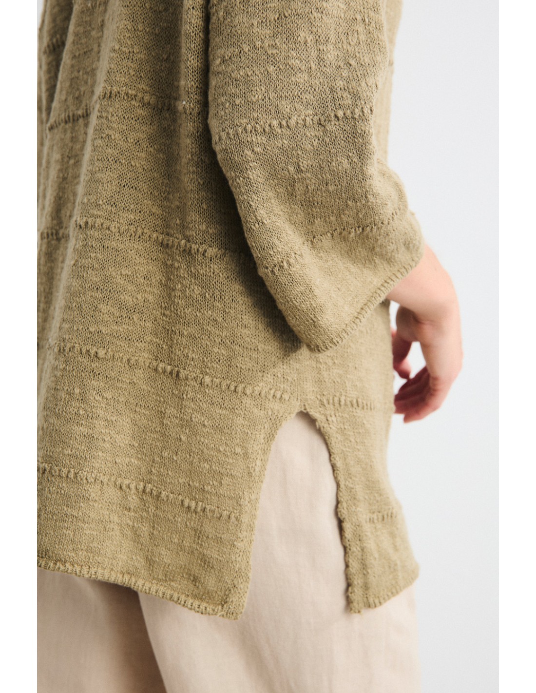 Fancy knitted kimono with three-quarter sleeves, that stands out for its texture and softness. It is part of the Nunavut family, along with the sweater and the T-shirt made from the same thread.
