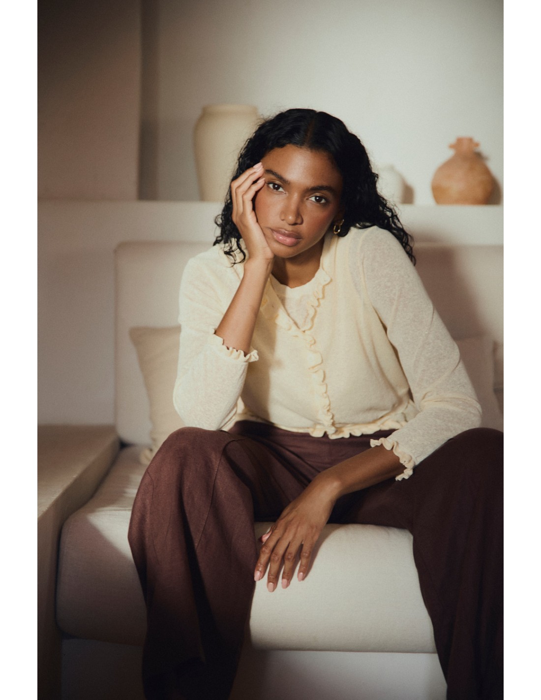Tricot cardigan with crew neck, delicate ruffle on cuffs and front placket. Combine it with the Mirri top for a modern and romantic total look.