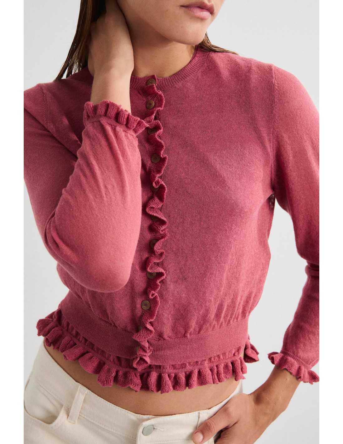 Tricot cardigan with crew neck, delicate ruffle on cuffs and front placket. Combine it with the Mirri top for a modern and romantic total look.