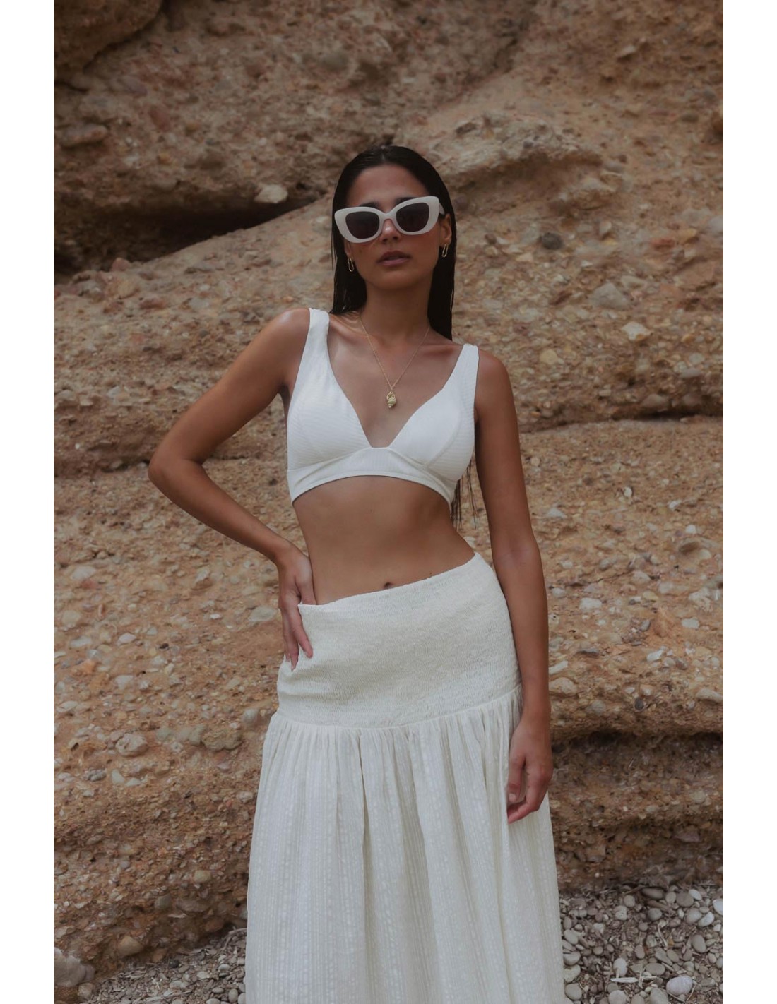 Bikini top with a V-neckline, wide straps and an underbust piece that ties at the back. Briefs with crossed waistband at the front for a slimming visual effect. It comes with openings with removable foam.The model is wearing size S.