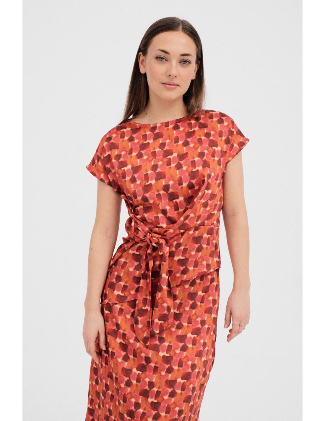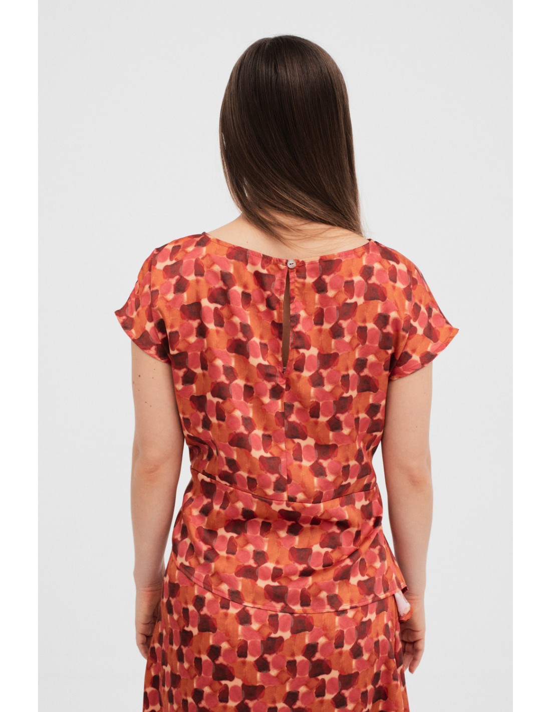 The Saude top is printed, with drop sleeves, boat neckline with button and teardrop on the back. Its laced waist and uneven hem make it perfect for a unique look. It goes with Sagene.