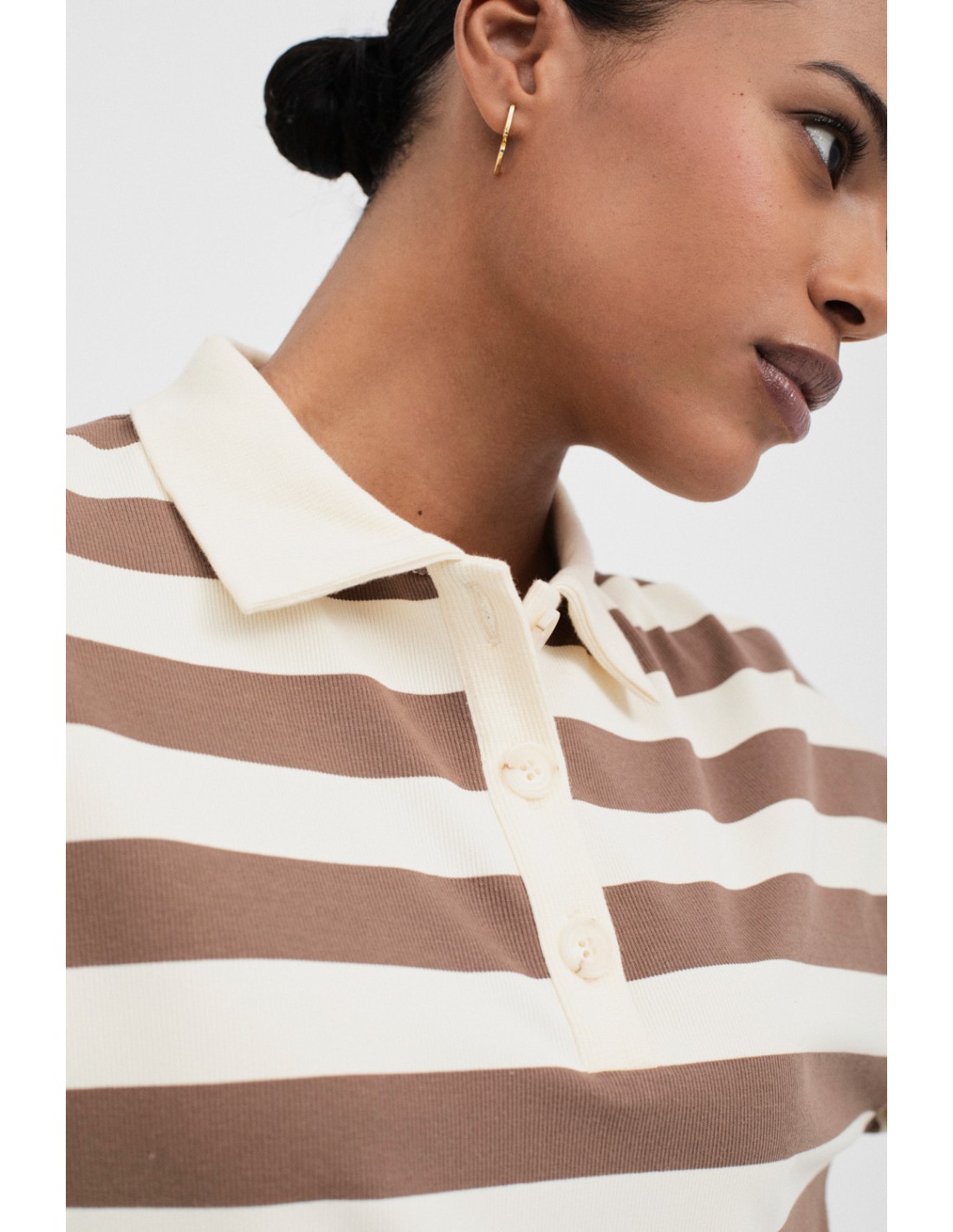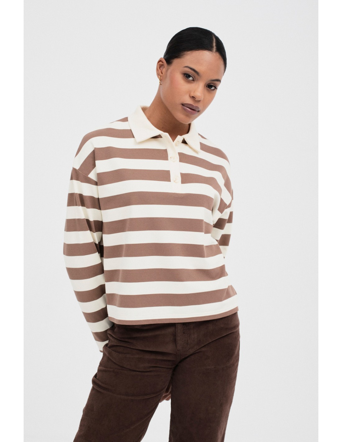 Pedralbes is a long-sleeved polo shirt with wide stripes. With a ribbed collar and placket in the same tone. Ideal for a casual look.