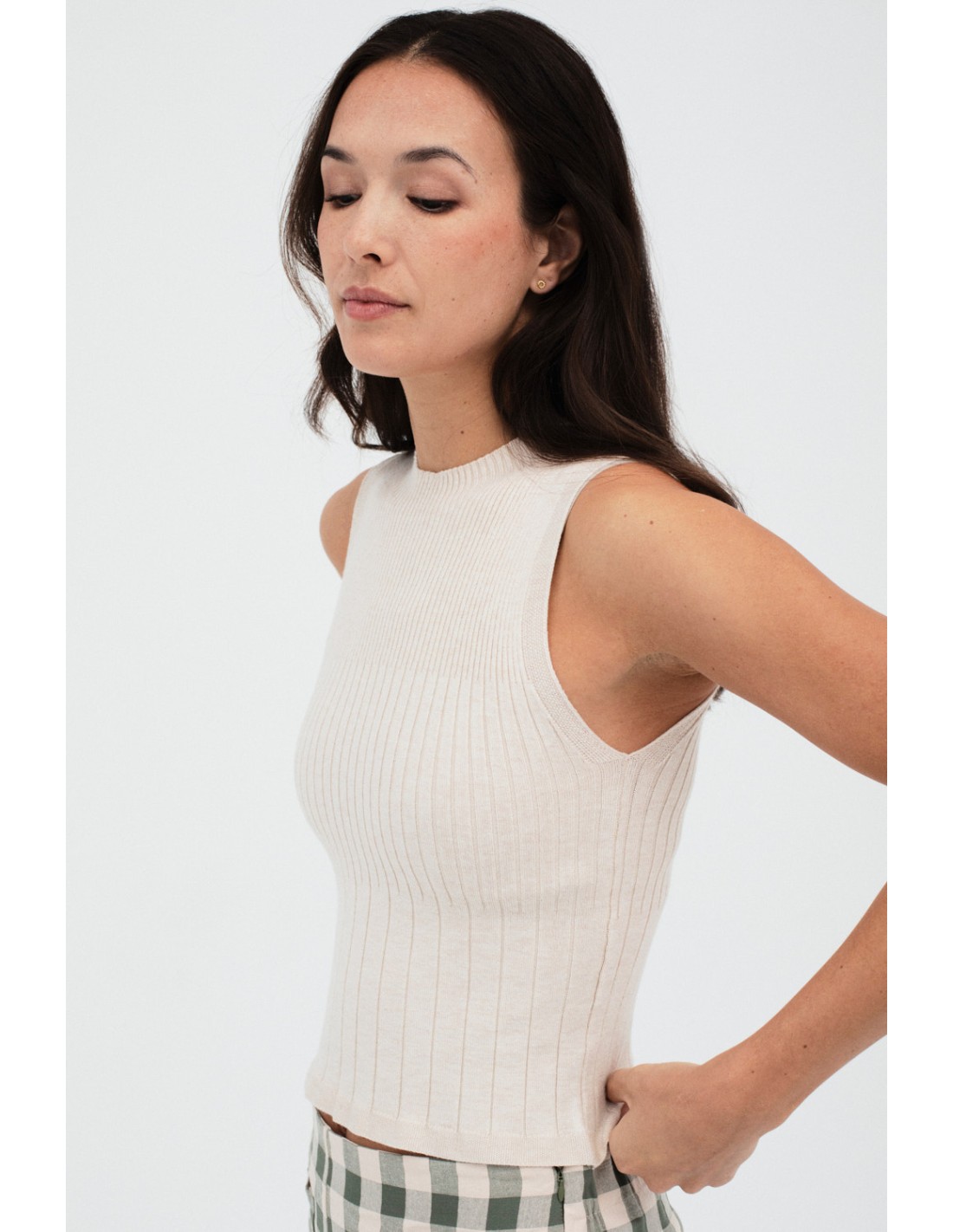 Sleeveless knitted top with a design that combines three different types of ribbing on the body. It has an elegant 2x2 ribbed turtleneck and fantasy stitch details on the armholes and hem. It goes perfectly with the Sufouh cardigan and Safa skirt.
