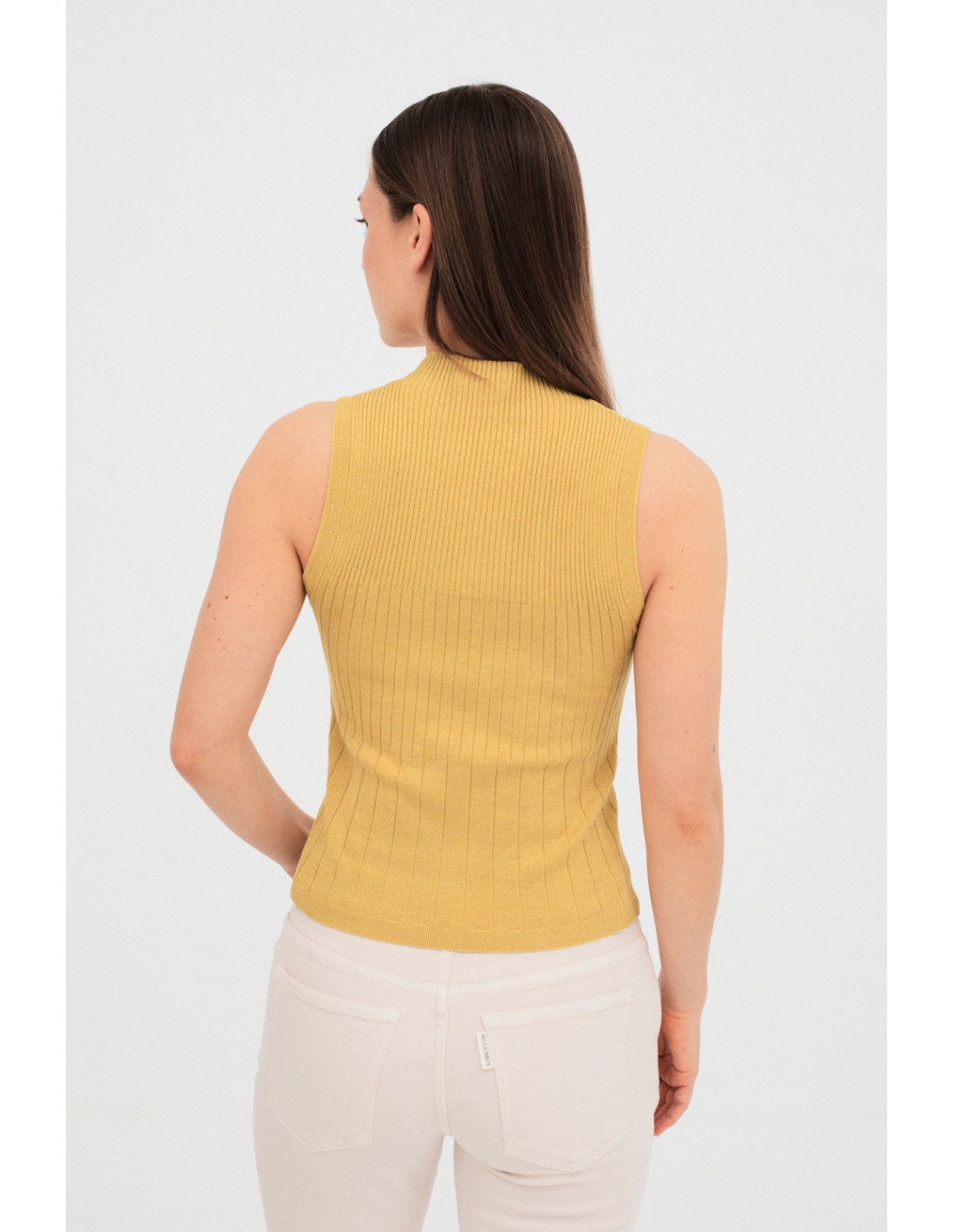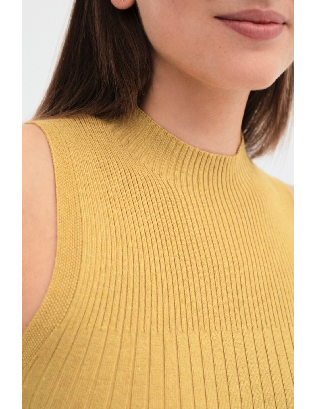 Sleeveless knitted top with a design that combines three different types of ribbing on the body. It has an elegant 2x2 ribbed turtleneck and fantasy stitch details on the armholes and hem. It goes perfectly with the Sufouh cardigan and Safa skirt.