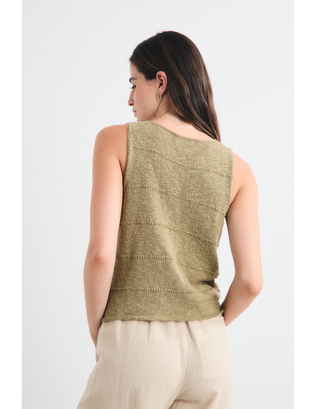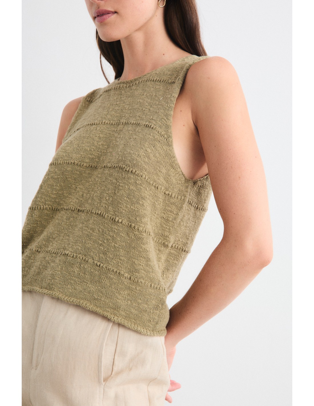 Fancy knitted top with round neckline and sleeveless. A light and delicate garment that is part of the Nunavut family, along with the jumper and the kimono knitted in the same yarn.
