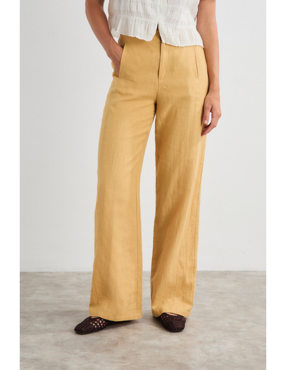 Straight and wide trousers, with double side seams and in-seam pockets. Zip and button fastening, with elasticated waistband at the back. Pair with the Akira blazer for a sophisticated total look ideal for warmer climates.