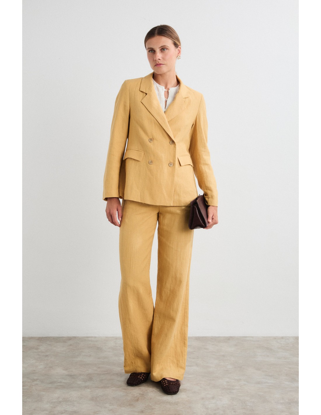 Straight and wide trousers, with double side seams and in-seam pockets. Zip and button fastening, with elasticated waistband at the back. Pair with the Akira blazer for a sophisticated total look ideal for warmer climates.