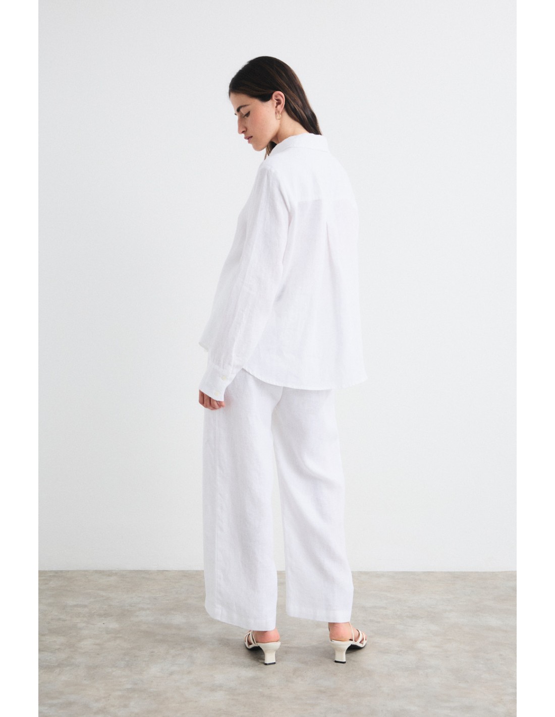 Wide linen trousers with front ribbing, flat waistband at the front and integrated elastic from the ribbing line. Combine with the Aurora shirt or top. Also available in the Aurora linen dress from the same family.