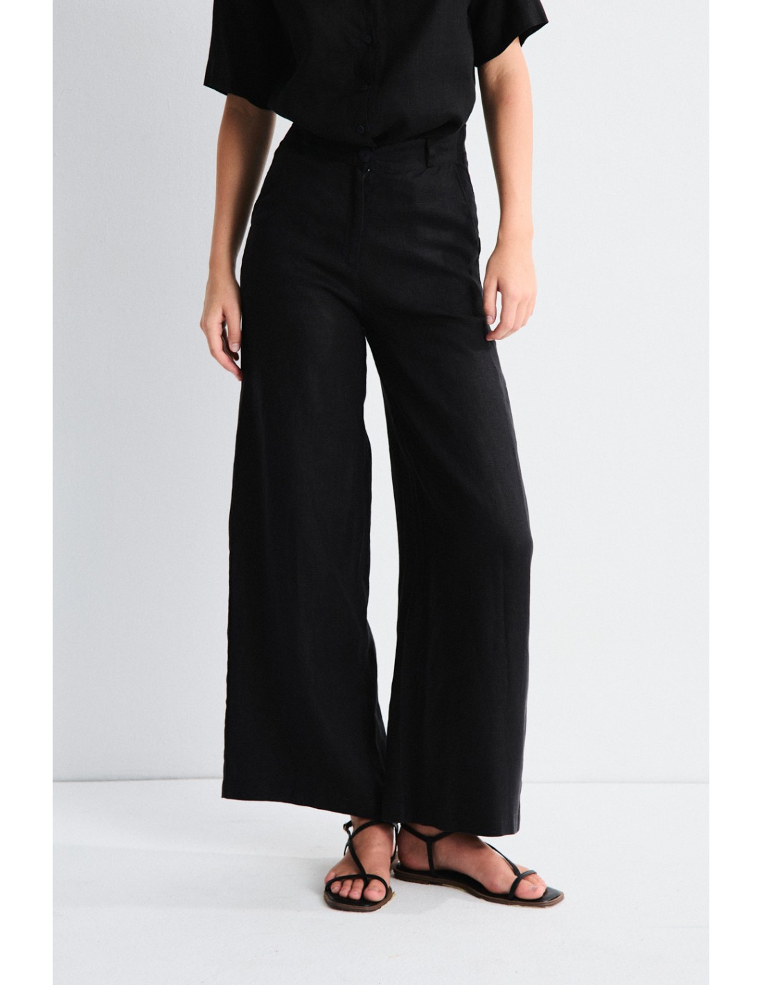 Linen trousers with fly, waistband with belt loops and elasticated back. Side pockets and double darts on the front. Front zip and button fastening. Get your total look by combining it with the kimono or the Bobby shirt, from the same family.