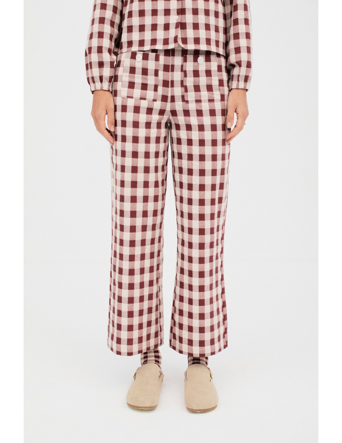 Vichy culotte trousers with flat back elastic, invisible zip on the side and front pockets with button. Match with Marlene blouse and Whitehall bag.